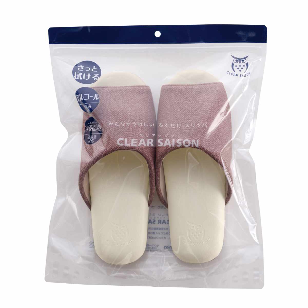 アルコールやウイルス抑制力に優れた次亜塩素酸の消毒液に対応できるPVCを甲表と中板に使用した、拭いてお手入れできるオープントゥのソフトスリッパ Sサイズです。通気性が良く、前開きなので蒸れにくいのも嬉しいポイントです。