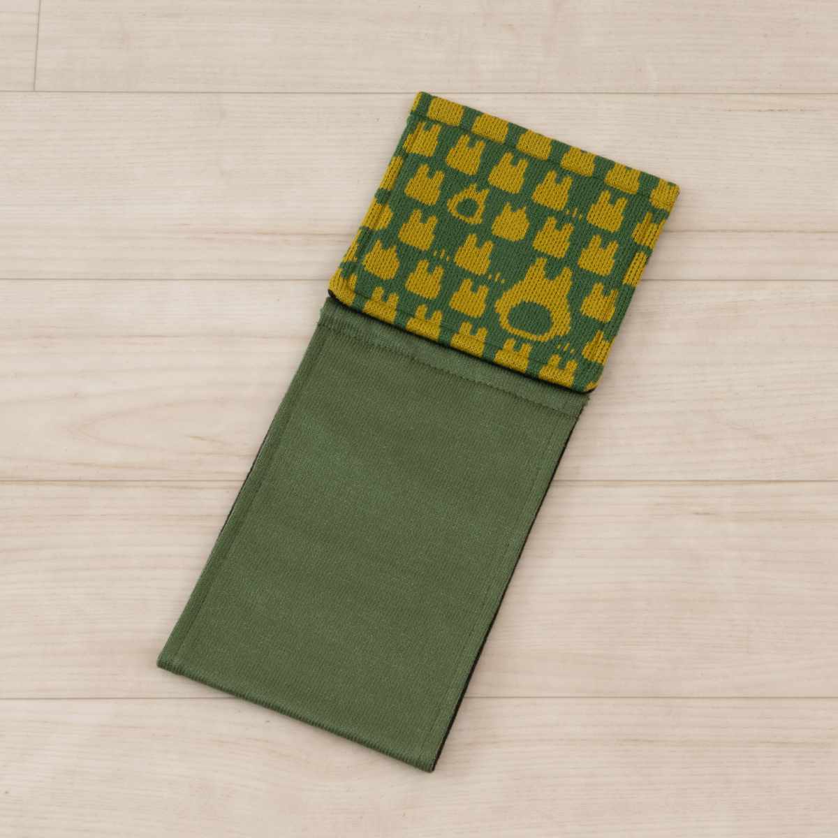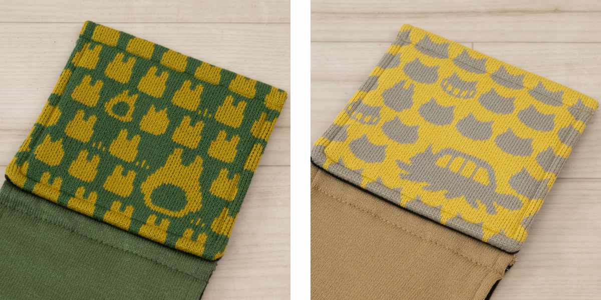 トトロやネコバスのシルエットを細かなニット編みで表現しています。ときどき違う動きをしている子が混じった楽し気なデザインです。