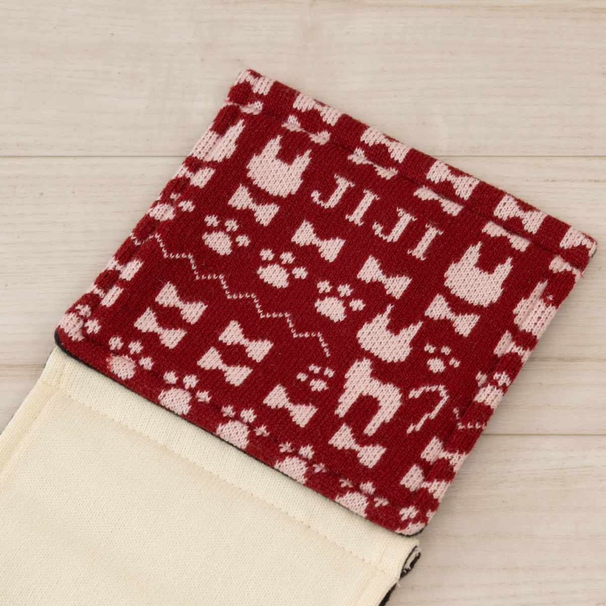 猫のモチーフや肉球、リボンなどを細かなニット編みで表現しています。魔女の宅急便の世界観が感じられるかわいいデザインです。