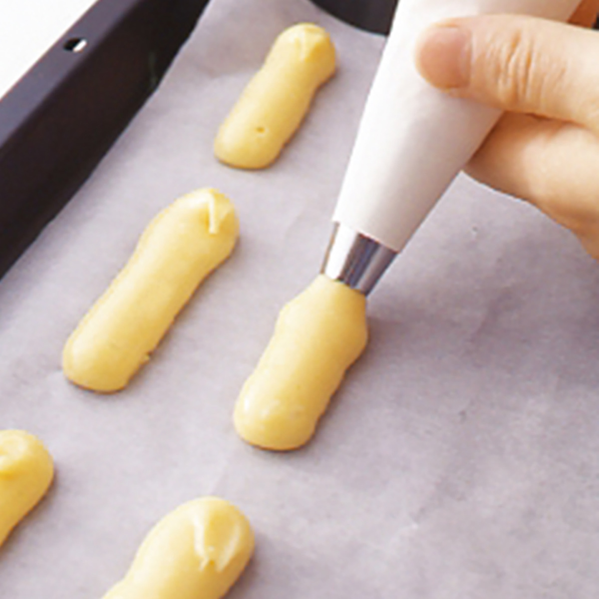 エクレアなどで生地を絞り出すのに便利な絞り口金です。口金を自由自在に使って、お菓子作りのバリエーションを広げてください。