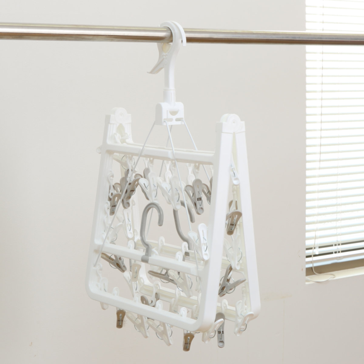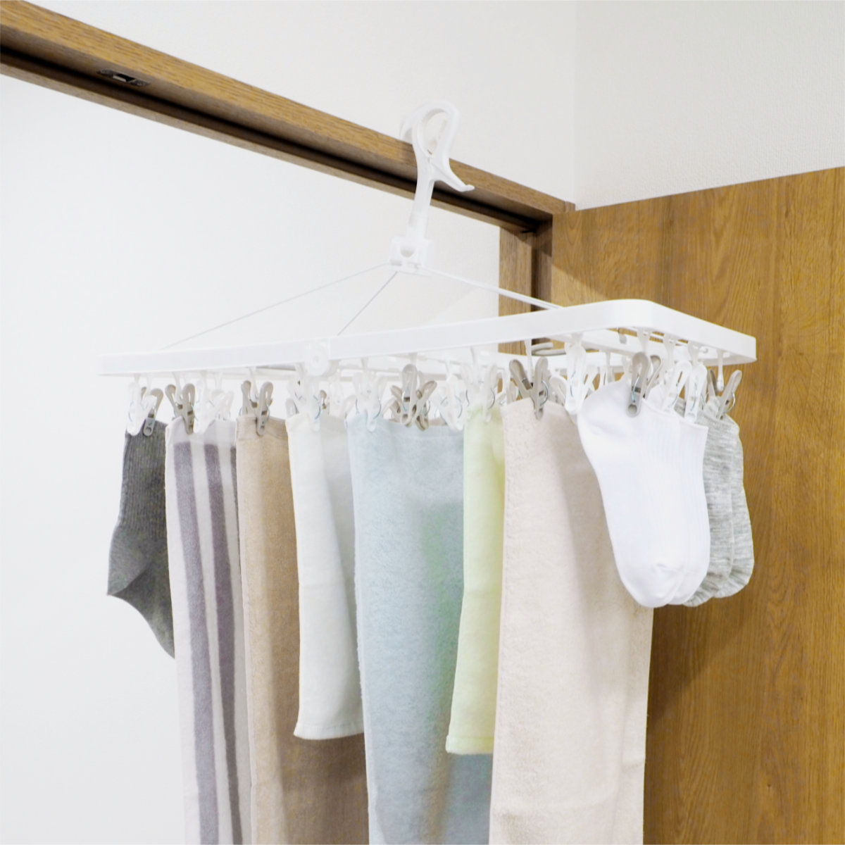 フック部にカモイ掛けが付いているので、カモイに掛けて部屋干しでも活躍します。