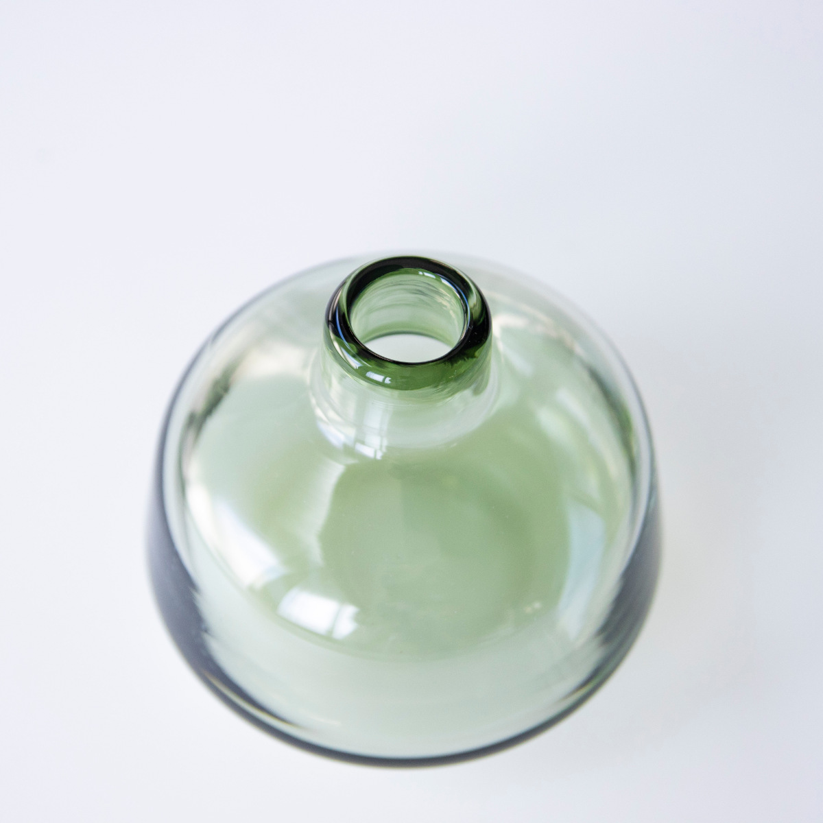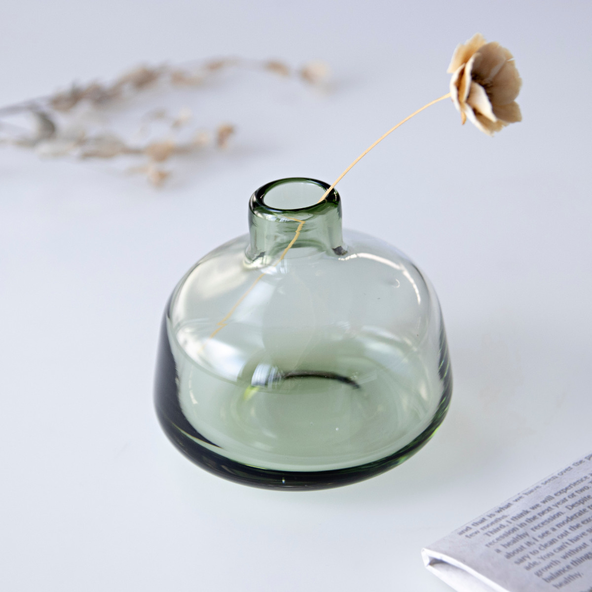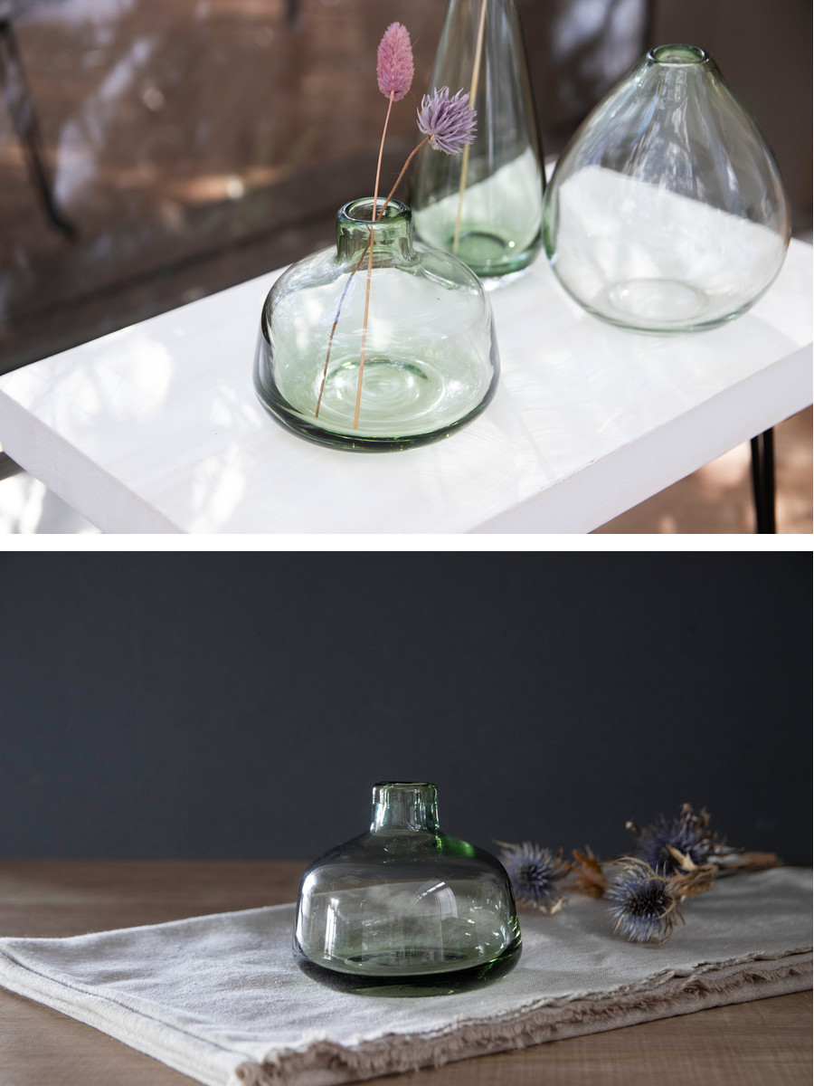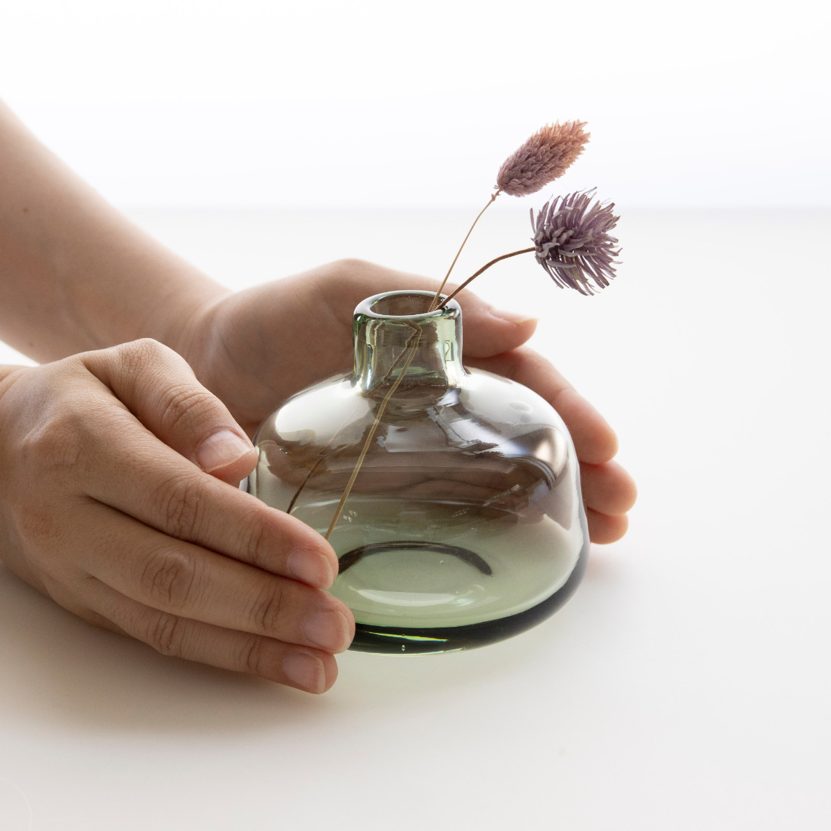 ぽってりとした厚みがかわいい、優しいグリーンカラーのガラスベースです。一輪挿して飾るだけで、インテリアの素敵なアクセントになります。ガーデニング好きの方はもちろん、お店のディスプレイとしてもおすすめです。