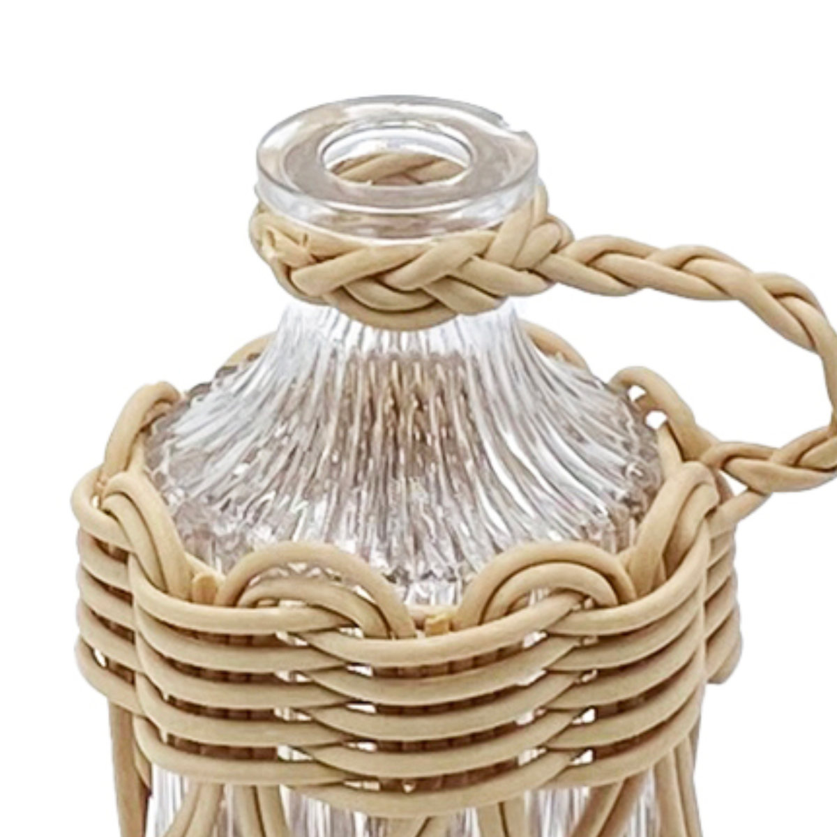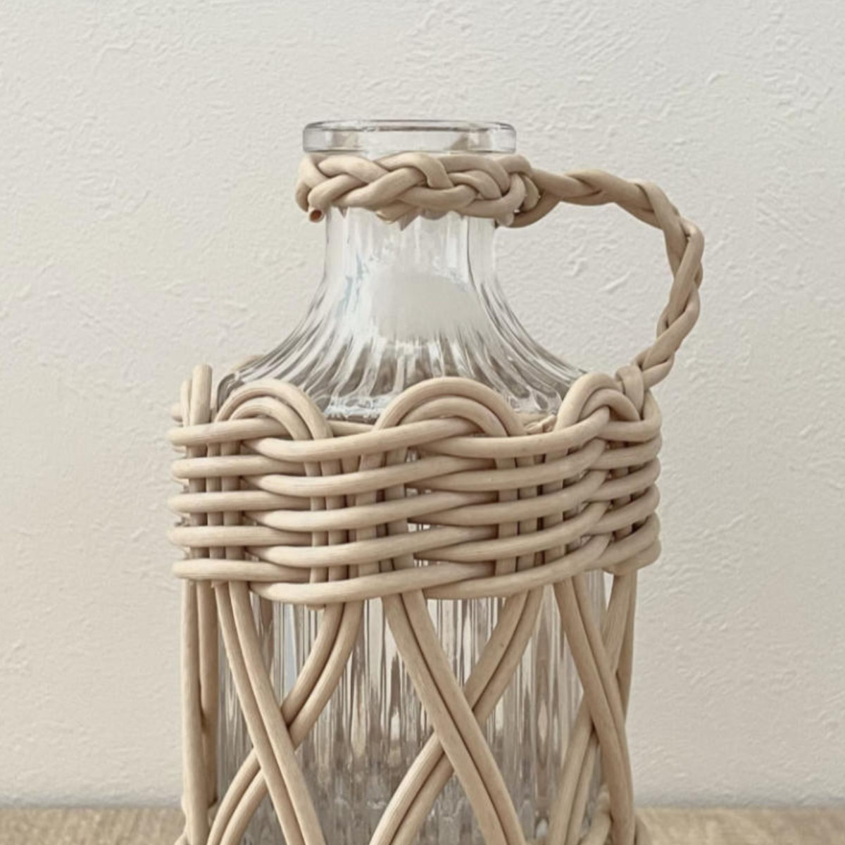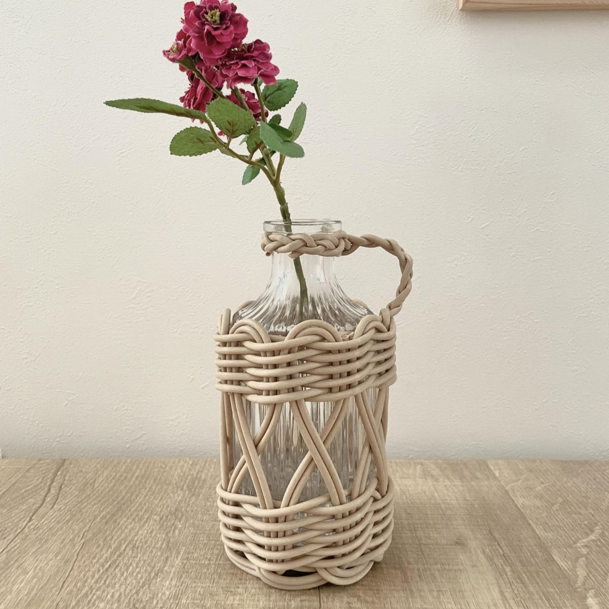 ガラスベースにバスケットのような飾り編みを施した、ナチュラルな雰囲気のフラワーベースです。小ぶりなサイズなので玄関や洗面所、リビングなど場所を選ばずどこにでも置きやすいです。
