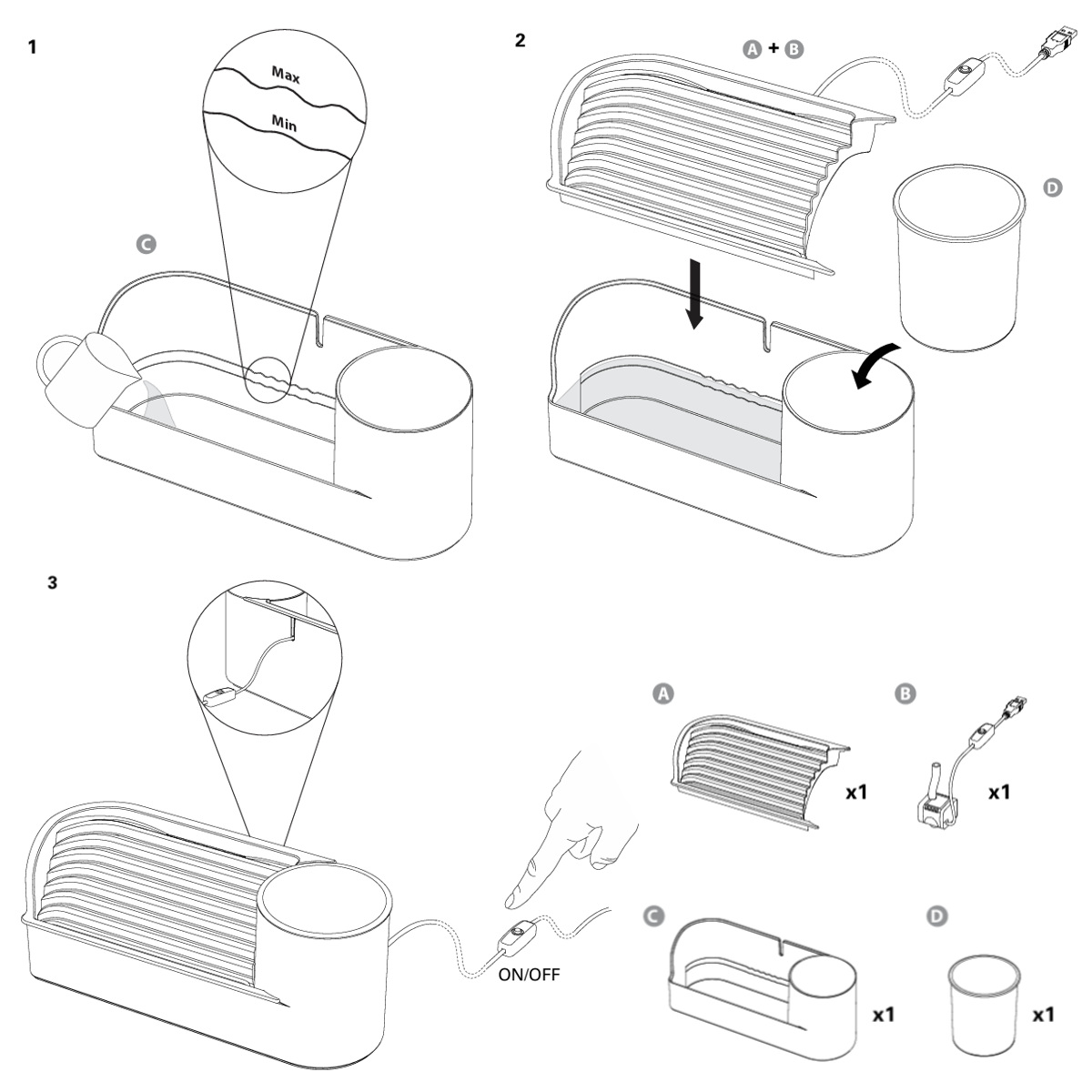 流す水の量は、MAXからMINの設定で調整が可能です。静かなせせらぎと安定した心地よいしたたり、お好みに合わせて調整できます。最大給水ラインで約50時間稼働します。