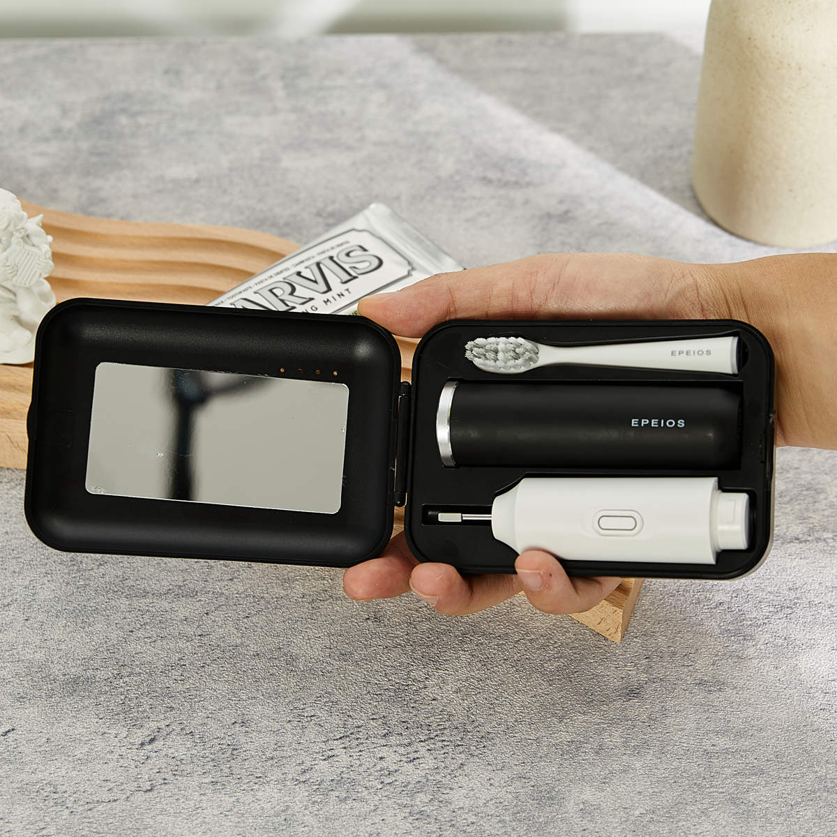 パーツが3つだけなので、簡単に組み立てができます。携帯ケースにはミラーがついているので、出先のちょっとした時間での口腔ケアに便利です。