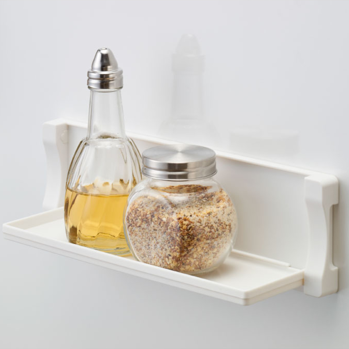 マグネットで浮かせられるので、キッチンのデッドスペースを有効活用できます。また身長や作業台の高さなどに合わせて、心地よく使える高さに取り付けられます。耐荷重は約1.5kgで、調味料を置くのにぴったりです。