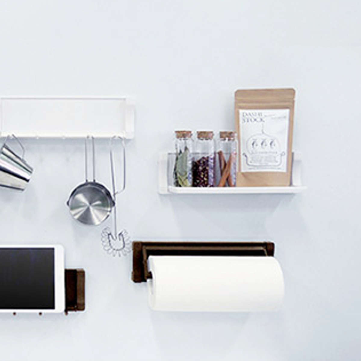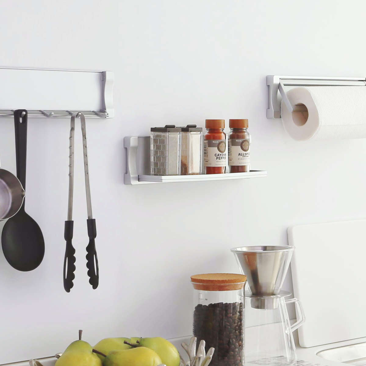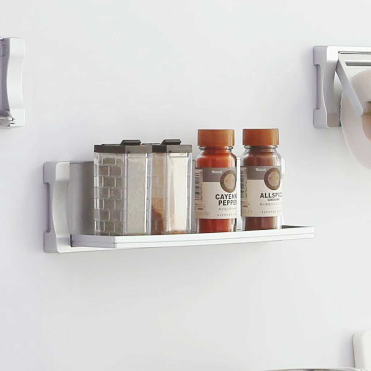 マグネットで浮かせられるので、キッチンのデッドスペースを有効活用できます。また身長や作業台の高さなどに合わせて、心地よく使える高さに取り付けられます。耐荷重は約1.5kgで、調味料を置くのにぴったりです。