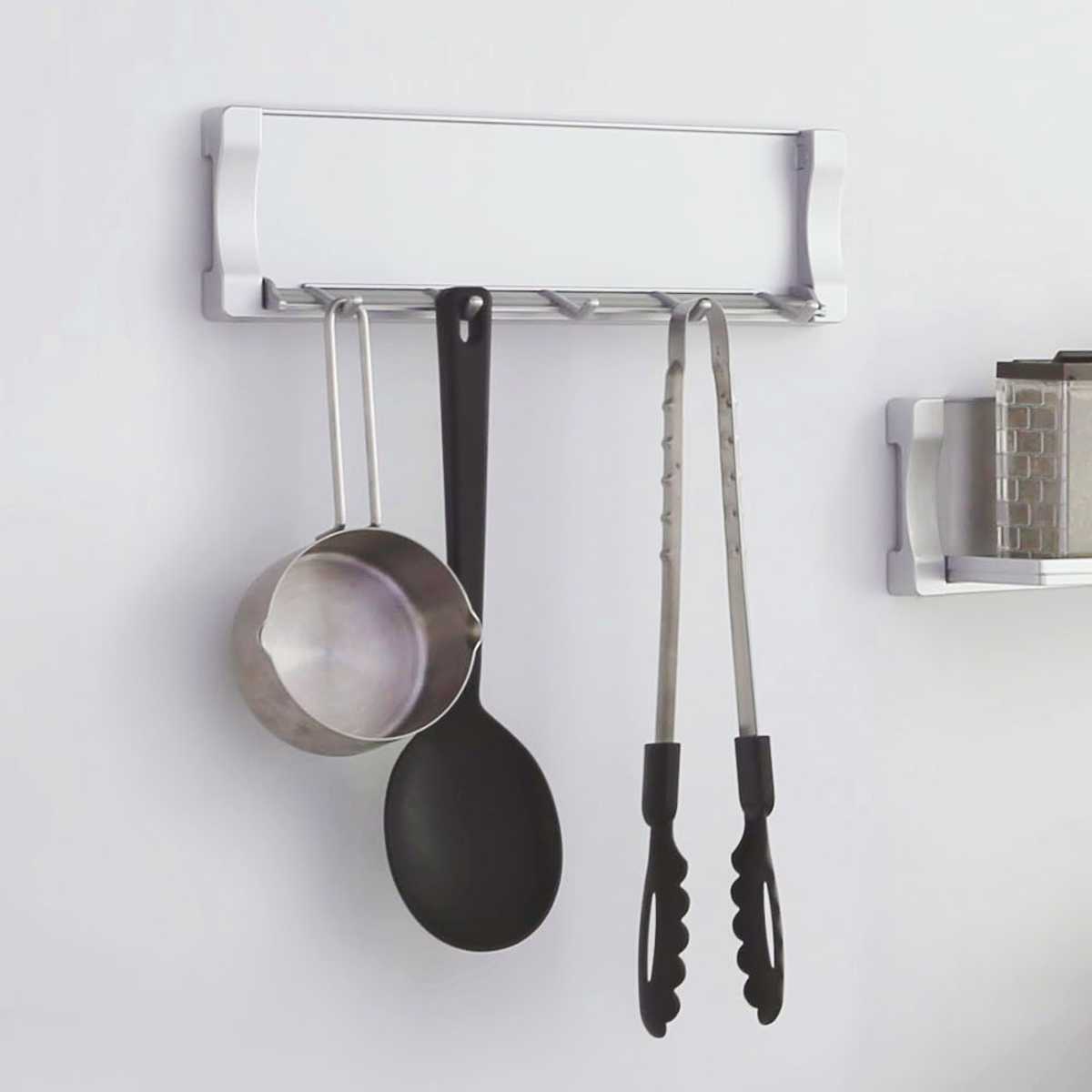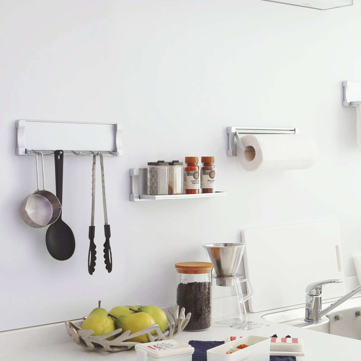 マグネットで浮かせられるので、キッチンのデッドスペースを有効活用できます。また身長や作業台の高さなどに合わせて、心地よく使える高さに取り付けられます。耐荷重は1本につき約300gです。