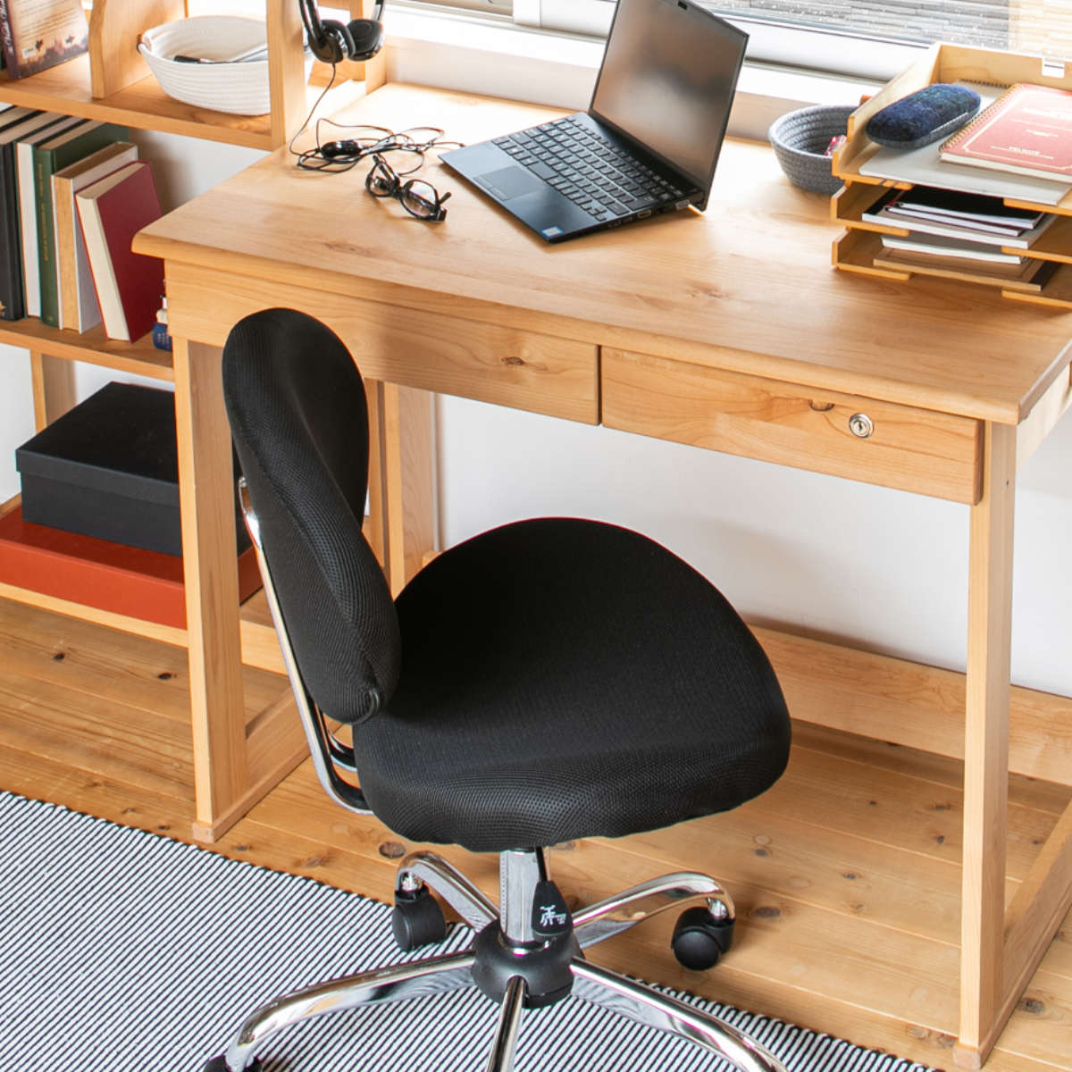 背もたれと座面には、身体が滑りにくく通気性の良いメッシュ生地を使用しているので、熱がこもらず快適です。