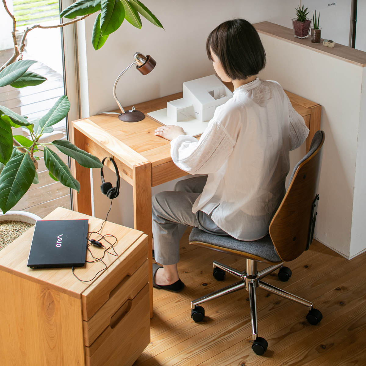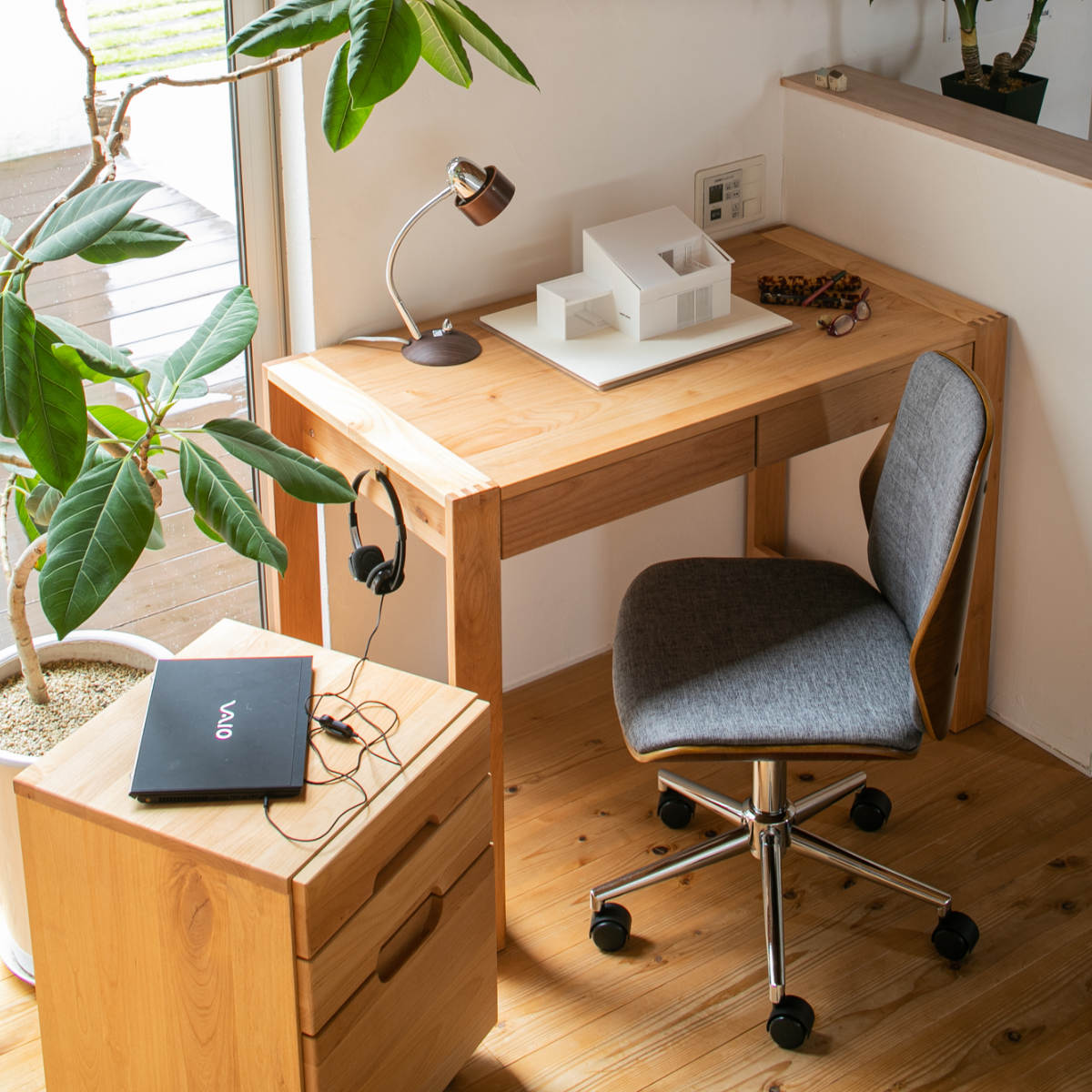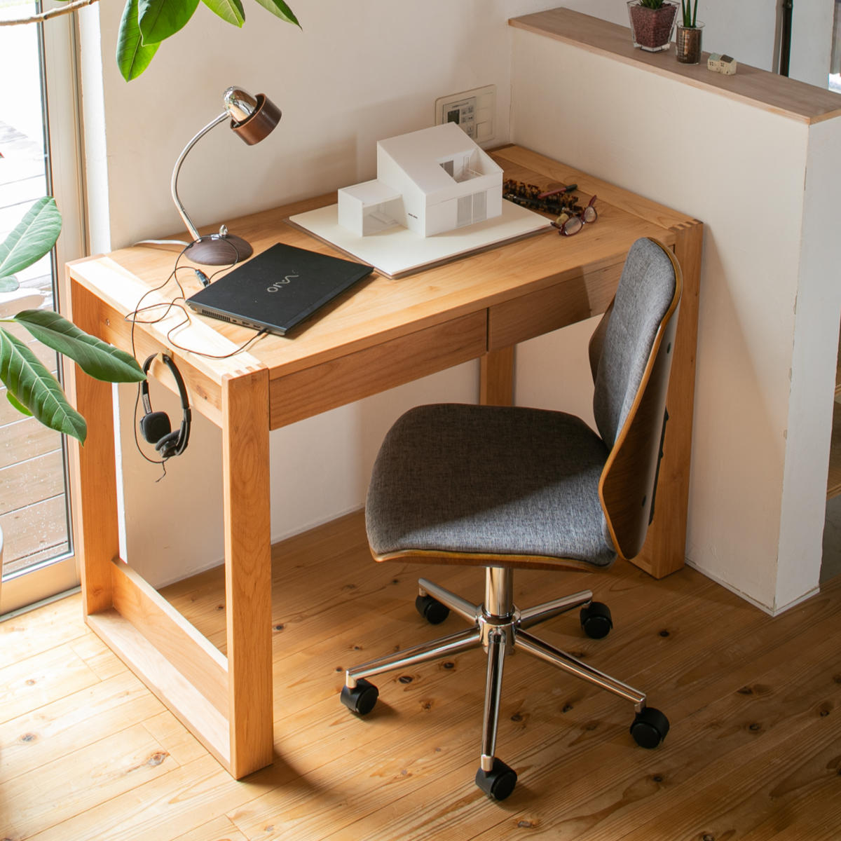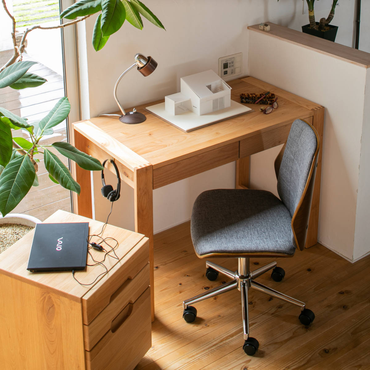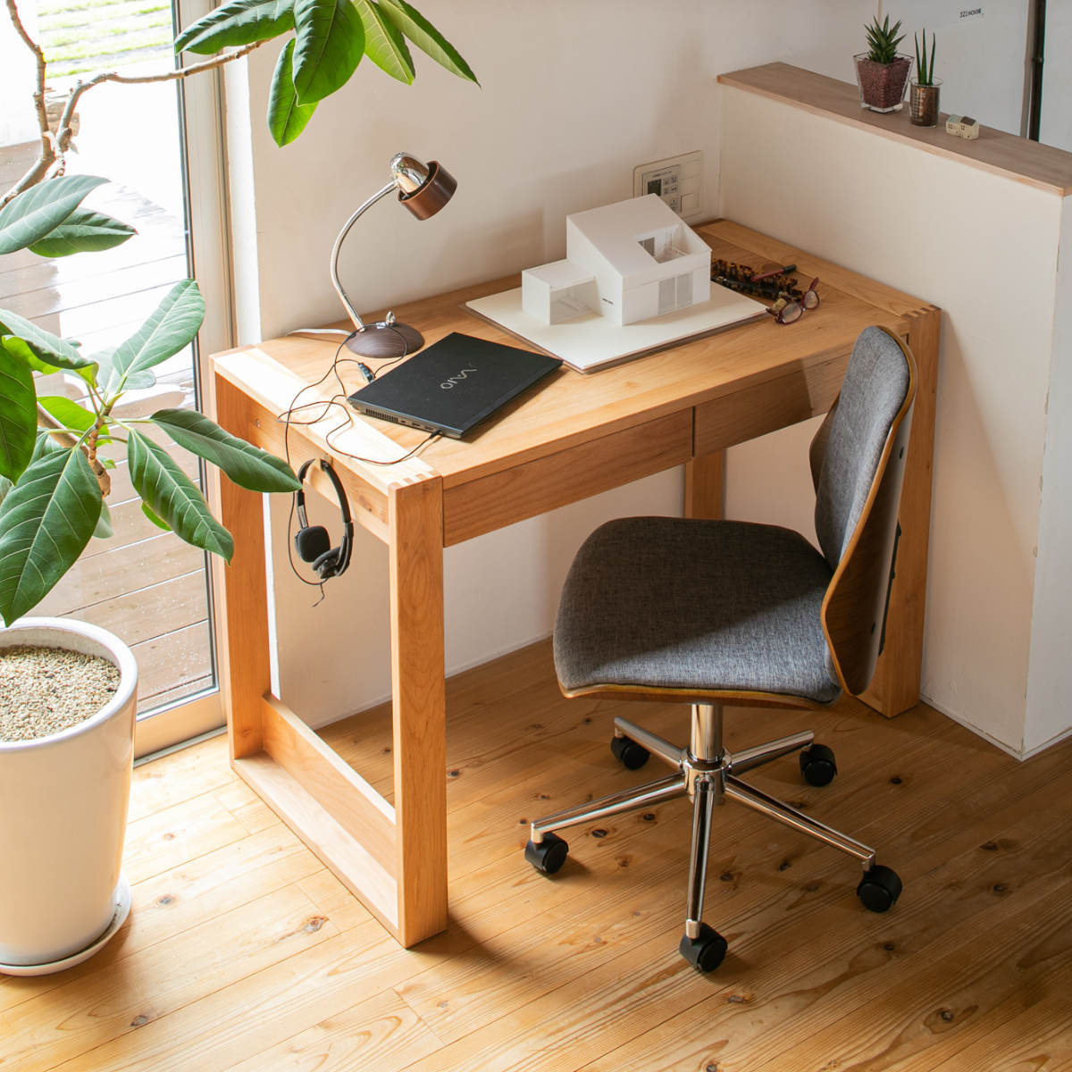 デザイン的にあしらった木組みがワンポイントのデスクです。お部屋のちょっとしたスペースに収まるコンパクトなサイズ感で、シンプルなデザインのためリビングにも設置することができます。