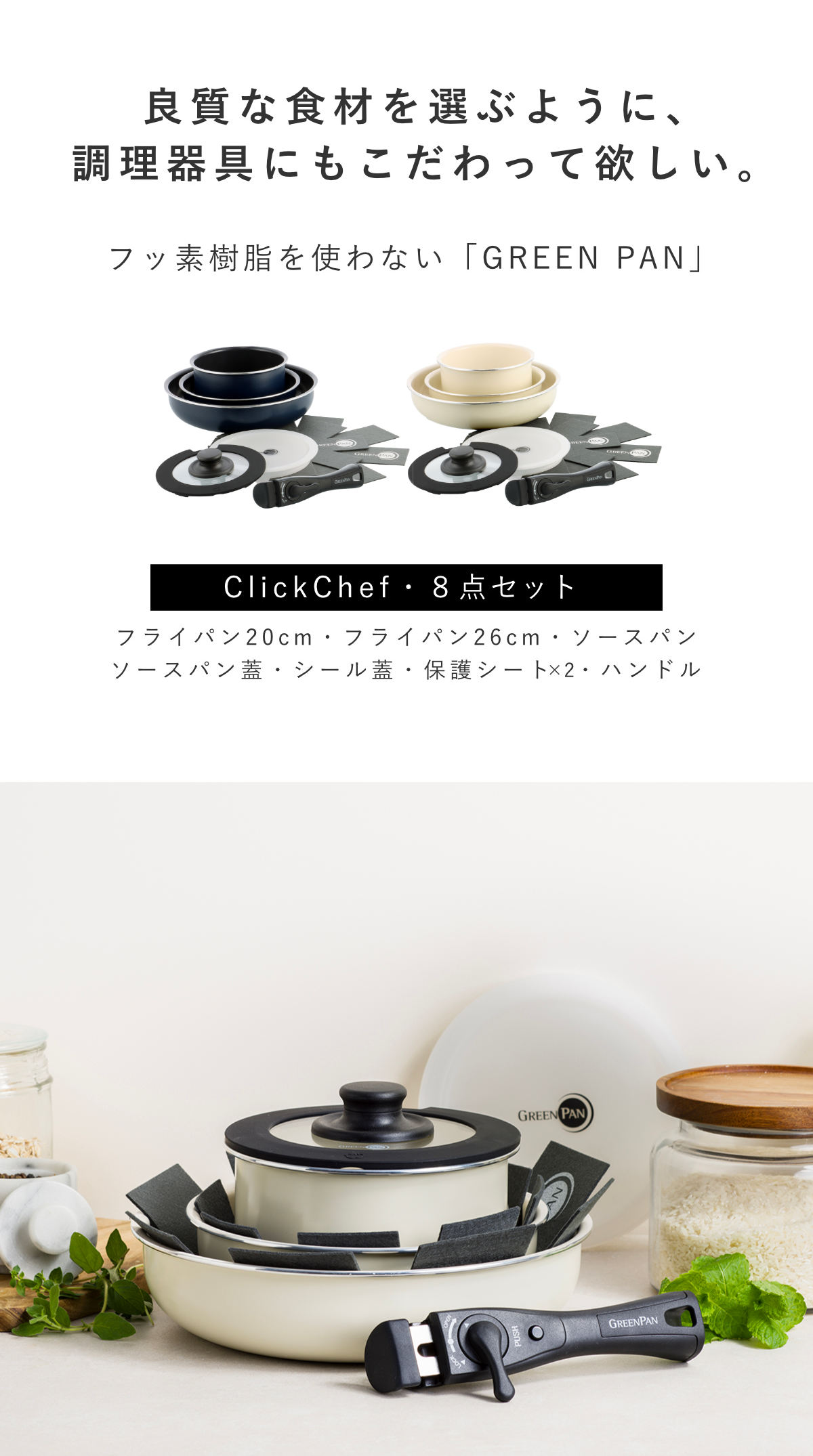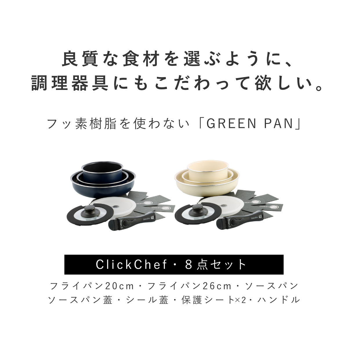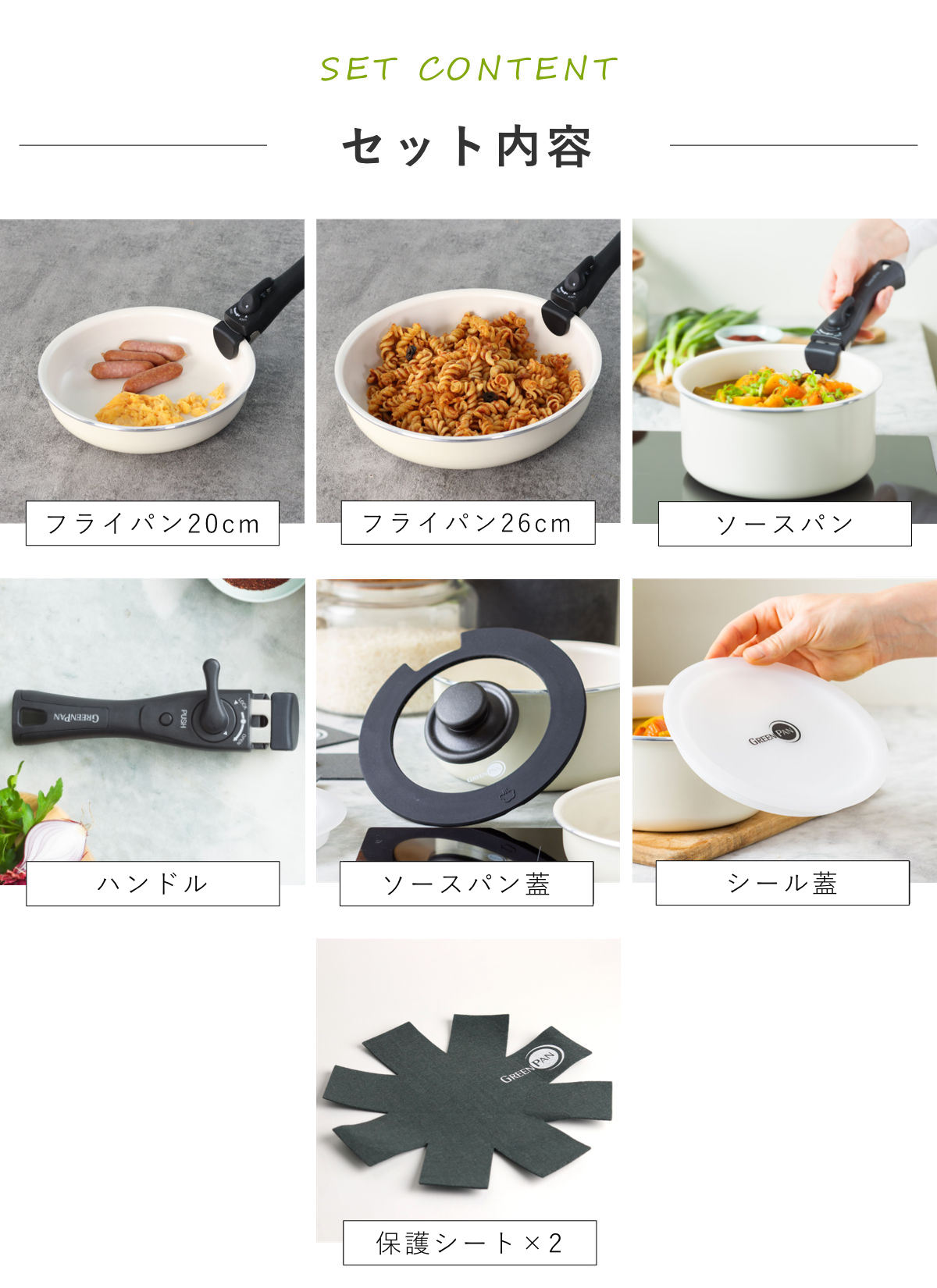 | 内容量 | 8点セット(フライパン20cm・26cm、ソースパン、ガラス蓋、シール蓋、ハンドル、保護シート×2) |