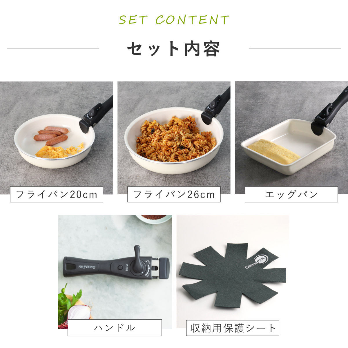| 内容量 | 5点セット(フライパン20cm、フライパン26cm、エッグパン、ハンドル、保護シート) |