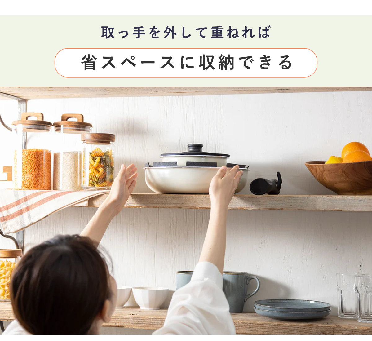 取っ手の取れるフライパンだから重ねることができ、限られたスペースにもすっきり収納できます。保護シートを間に挟むことで、フライパンが傷つくことを防ぎます。