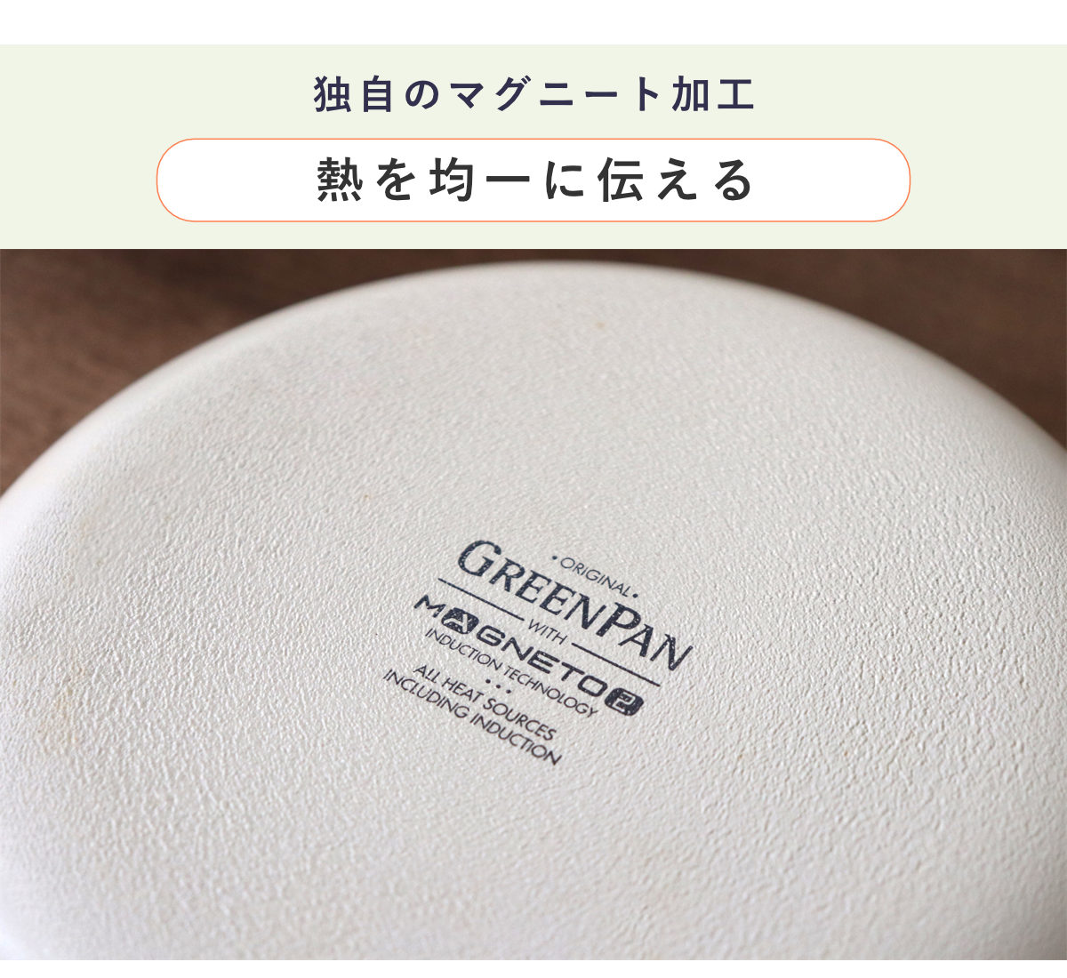 熱変形に強く、熱伝導の良い独自のマグニート加工を施しています。熱をムラなく伝えて料理を美味しく仕上げます。