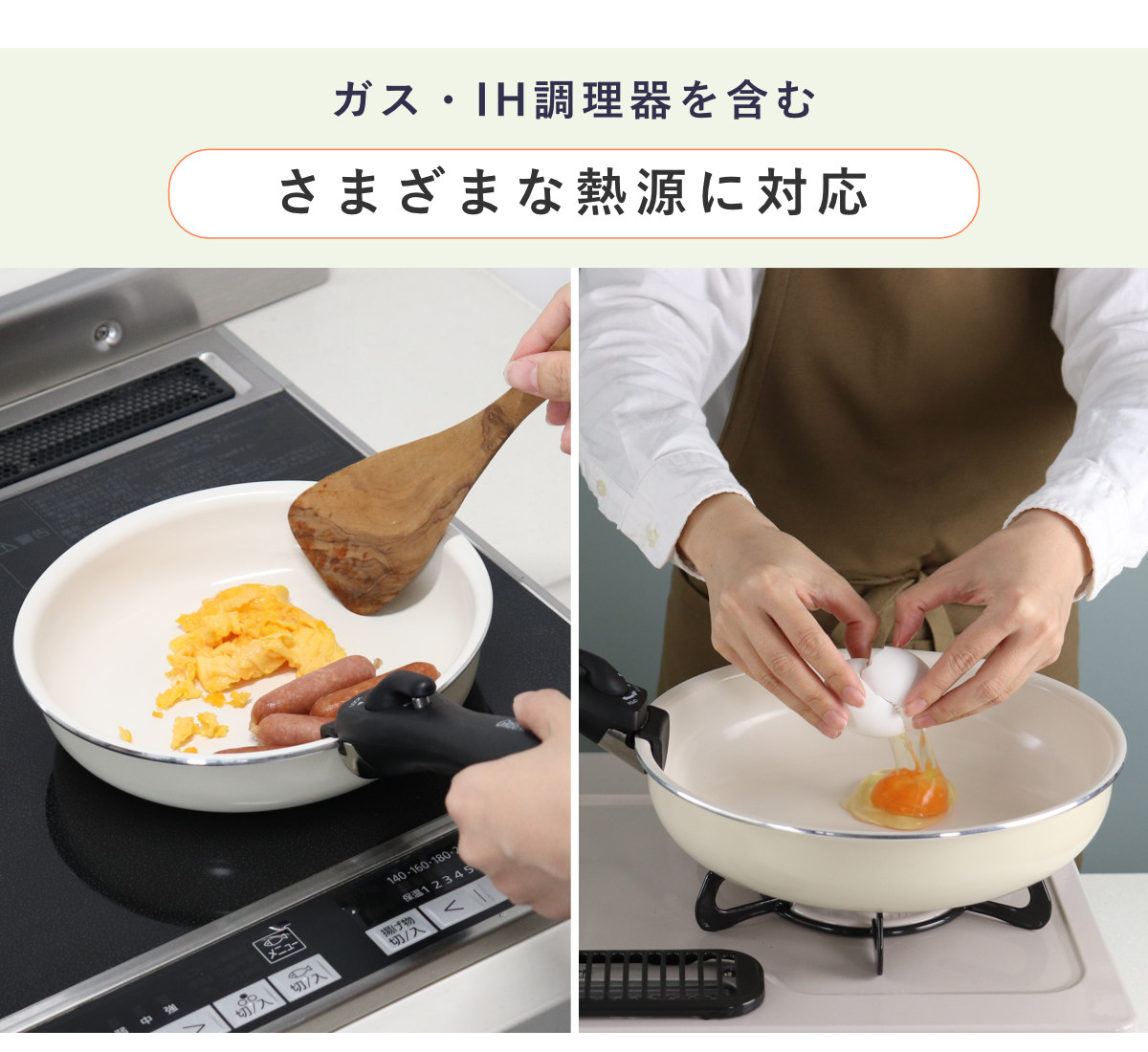ガス・IHクッキングヒーターなどあらゆる熱源でお使いいただけます。高温で調理しても底が変形しにくいため、熱源を選びません。