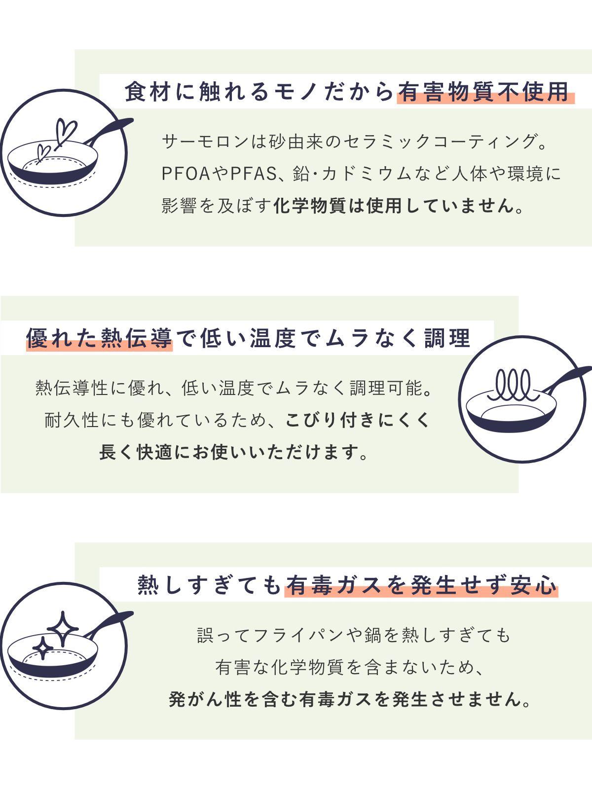 | 材質 | 本体:アルミニウム合金 表面加工(内面・外面):セラミックコーティング ハンドル:フェノール樹脂・ステンレス鋼・シリコーンゴム 保護シート:フェルト |