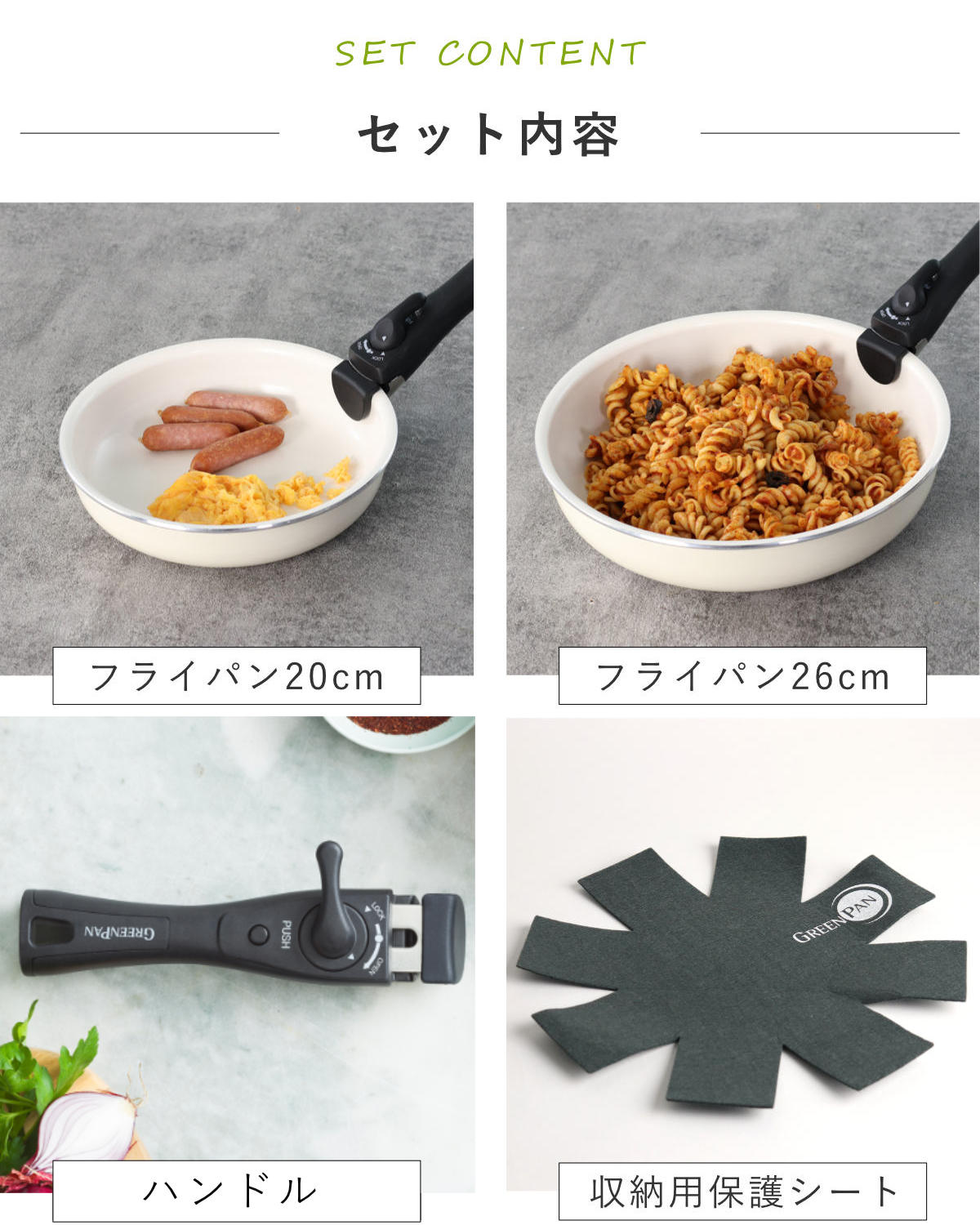 | 内容量 | 4点セット(フライパン20cm、フライパン26cm、ハンドル、保護シート) |