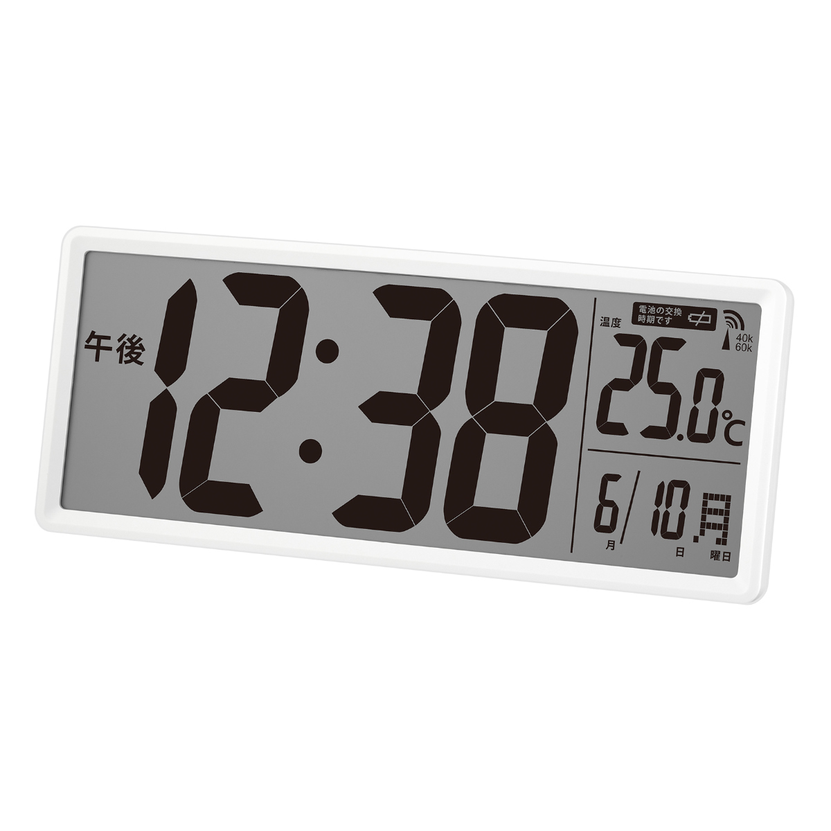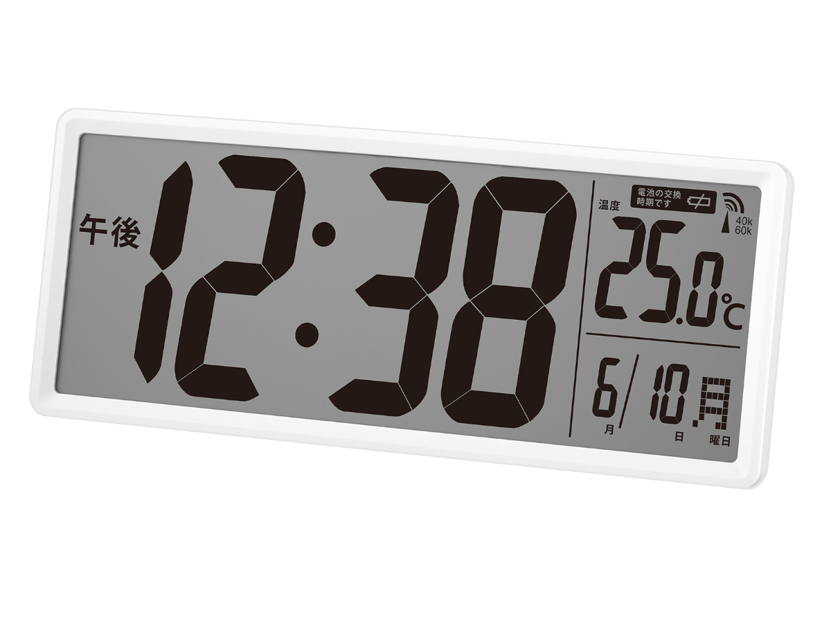 共有スペースで使える大型サイズのデジタル電波時計です。画面が大きくて見やすく、シンプルなデザインの時計はどんなお部屋にも調和し、長く愛用していただけます。