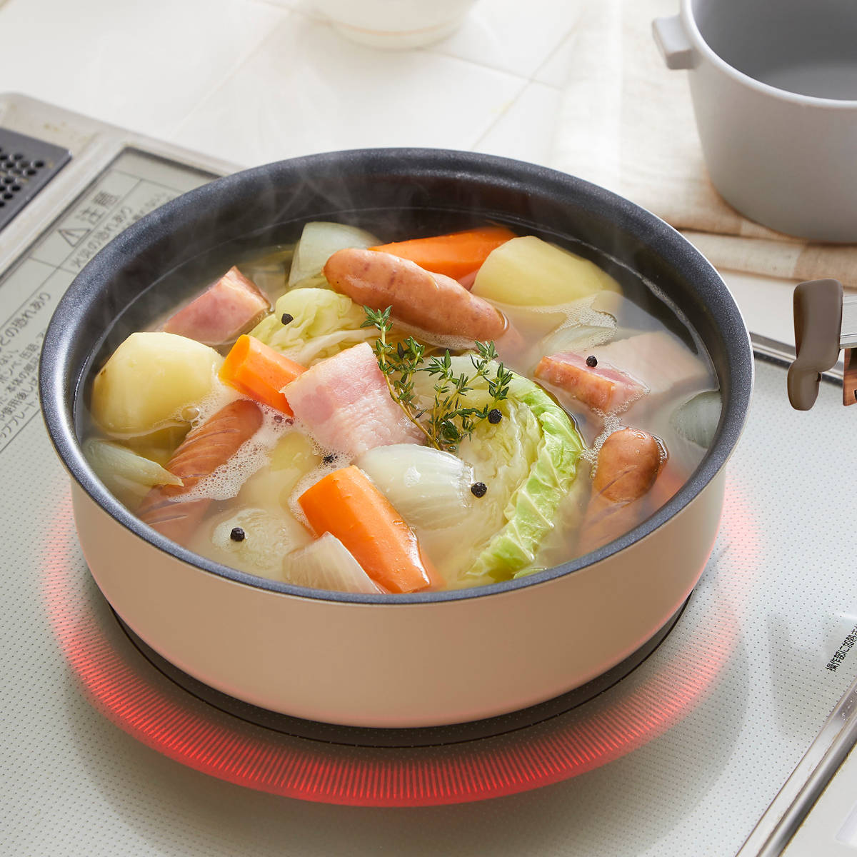 調理後はハンドルを外して、そのままお皿のように食卓へ出せます。盛り付けの手間や洗い物が減り、シンクでも場所を取らず隅々まで洗えて清潔に使えます。