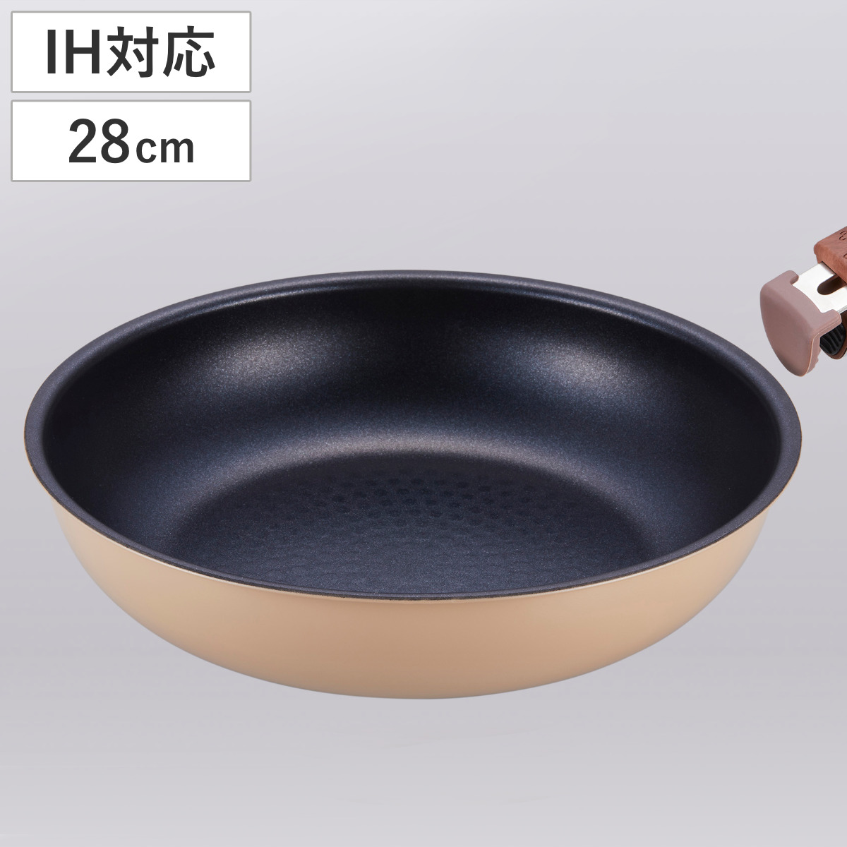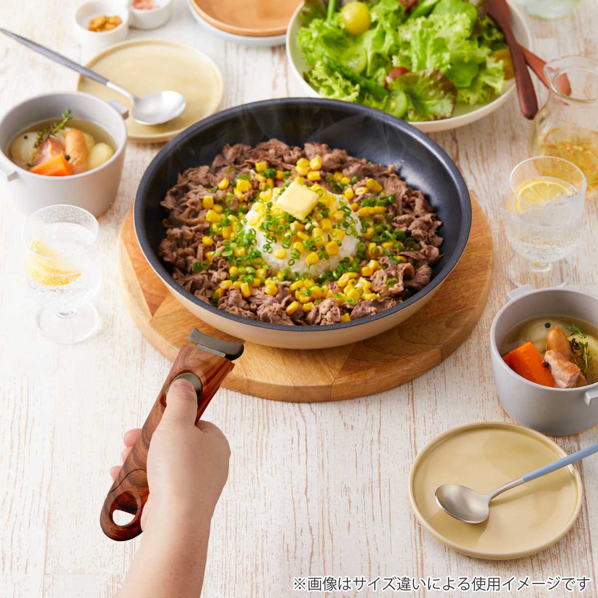 ハンドルが着脱できるフライパンです。2~4人分の調理に便利で、メインから副菜まで活躍する使い勝手の良い万能サイズです。