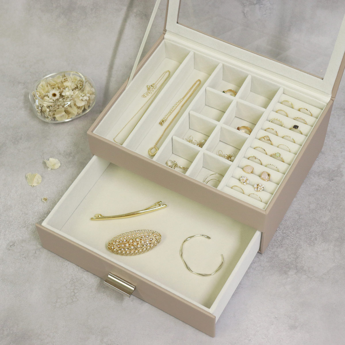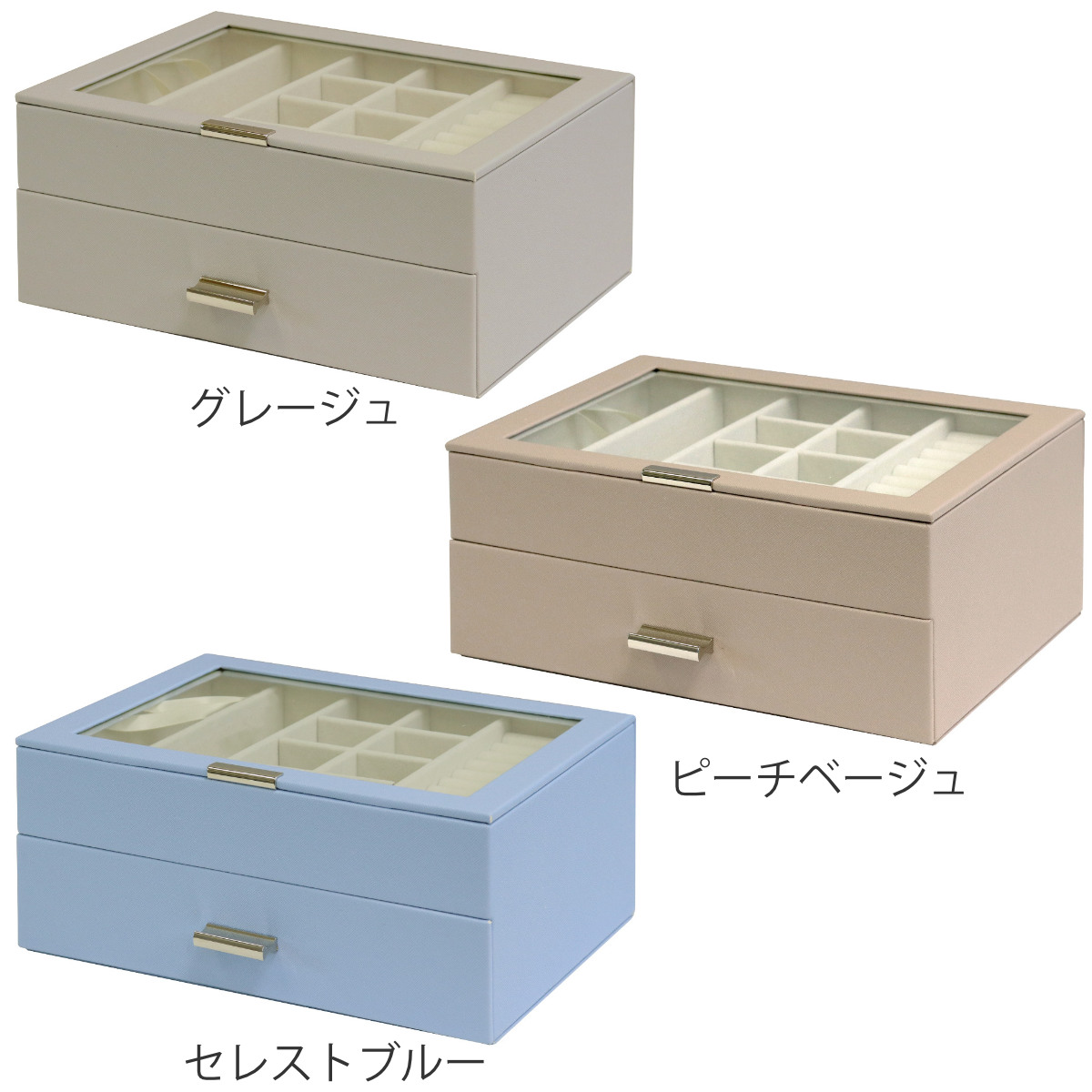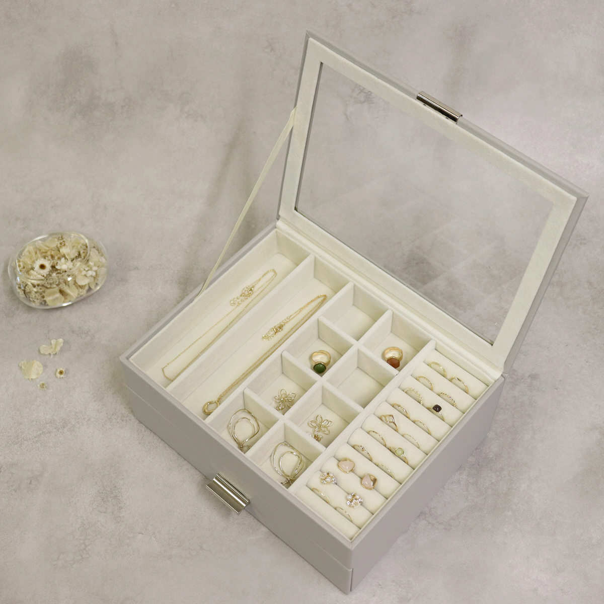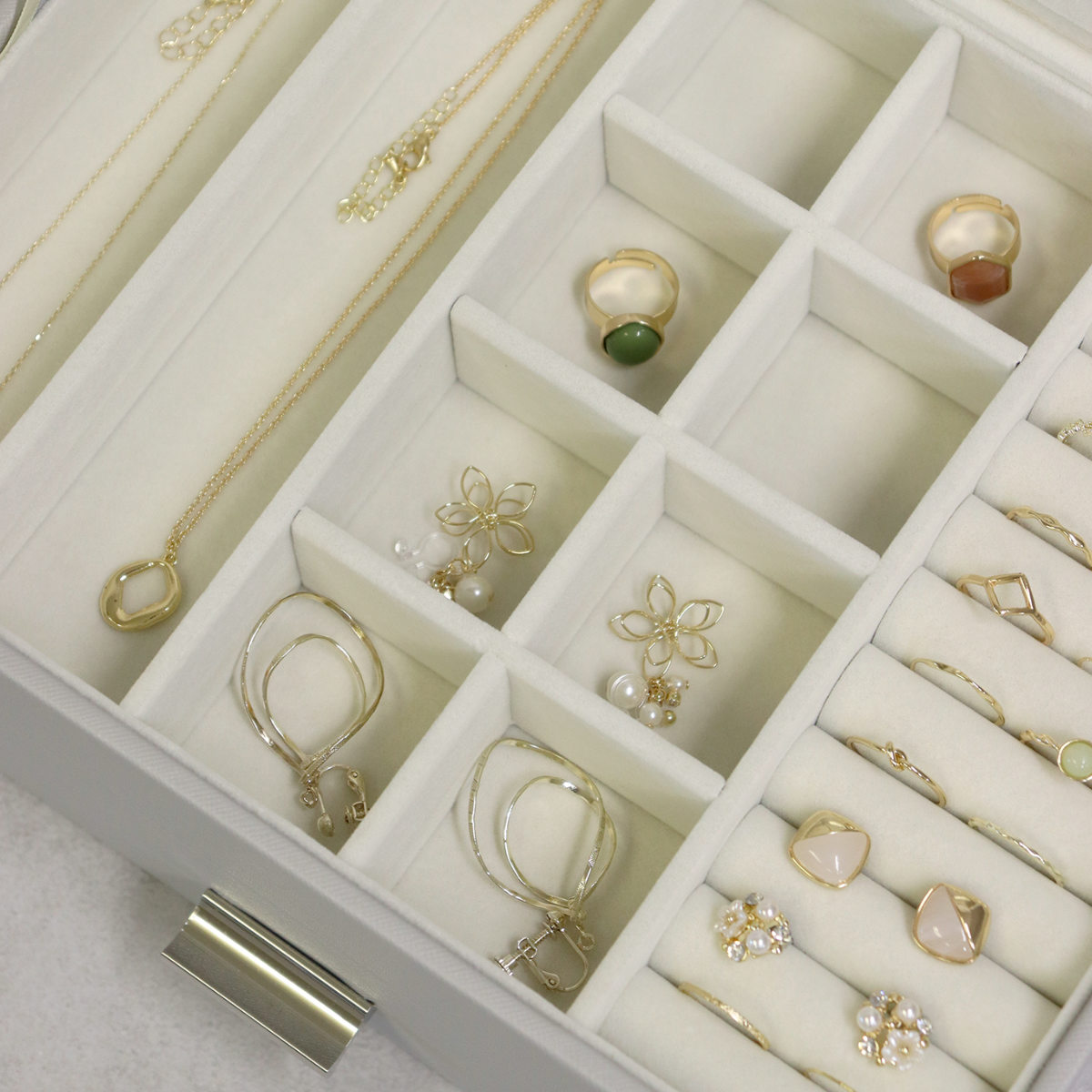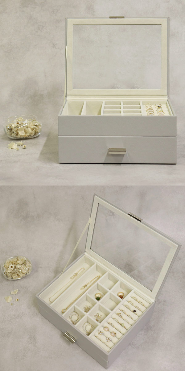 上段は細かく仕切られているので、リングやネックレスなどの収納に最適です。下段はフリースペースで、ブレスレット、サングラスなどの大きなアイテムを収納できます。
