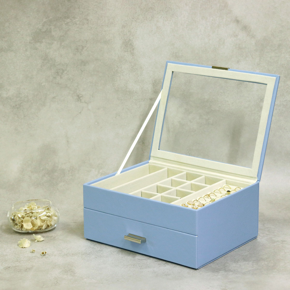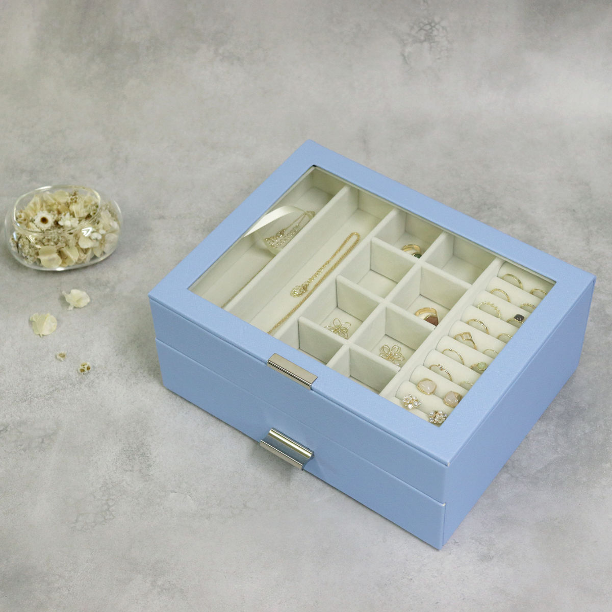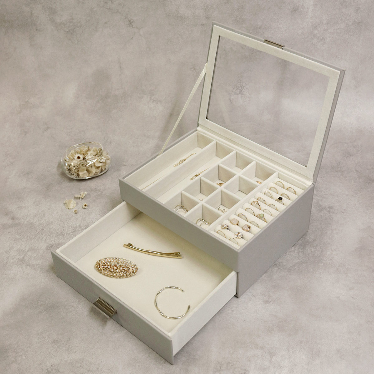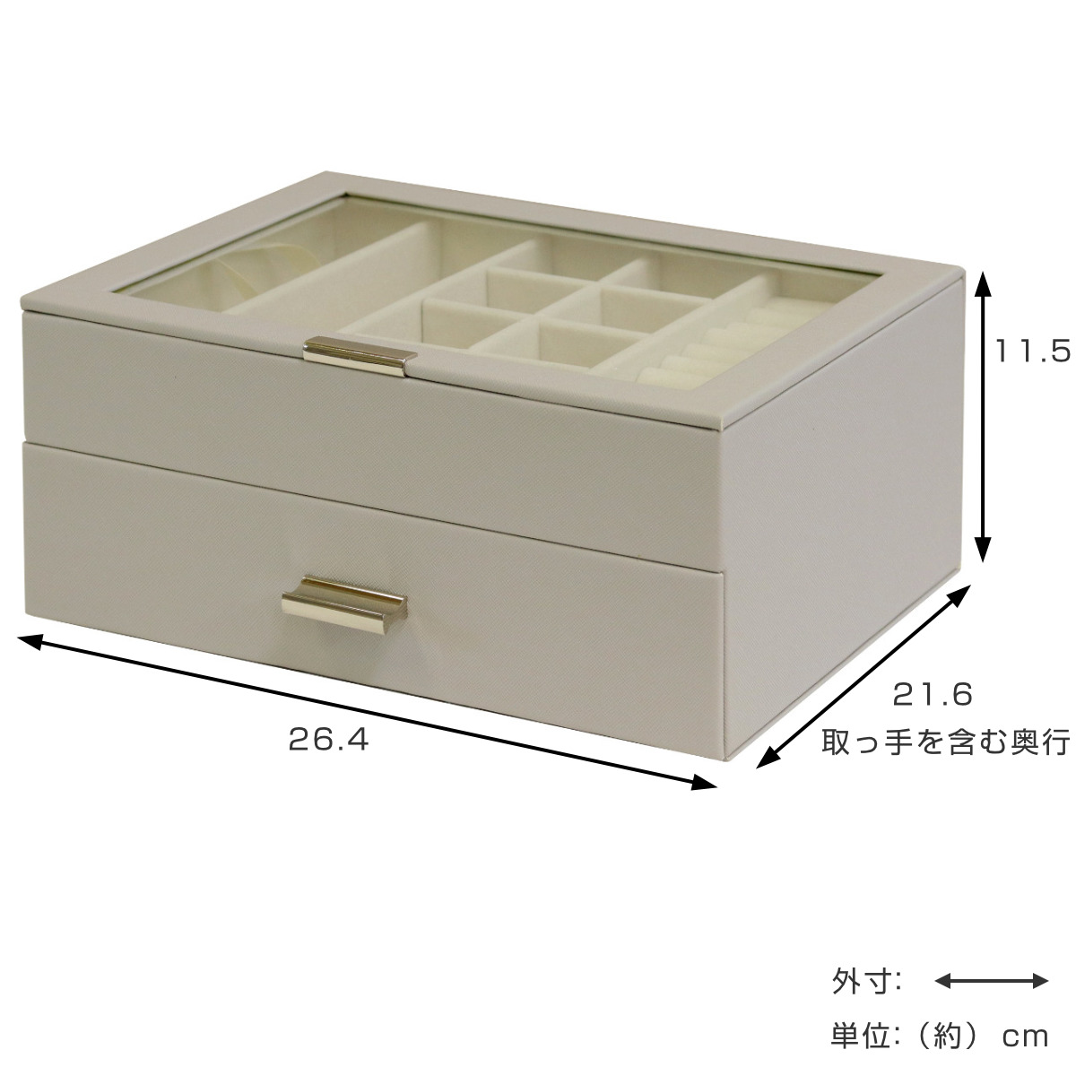 上段は細かく仕切られているので、リングやネックレスなどの収納に最適です。下段はフリースペースで、ブレスレット、サングラスなどの大きなアイテムを収納できます。