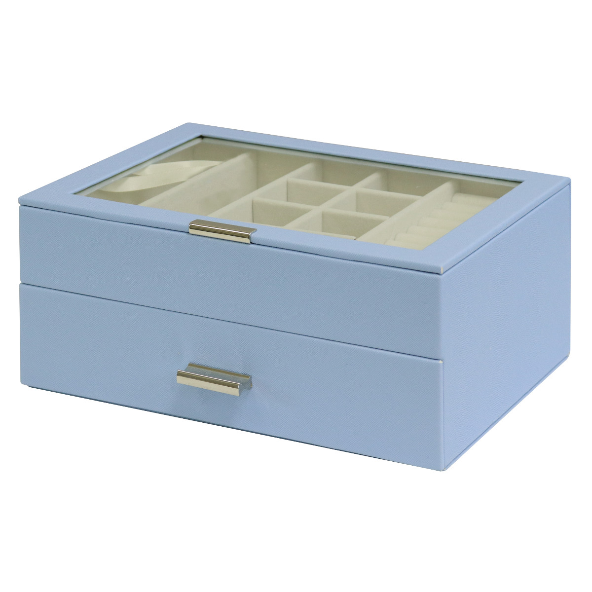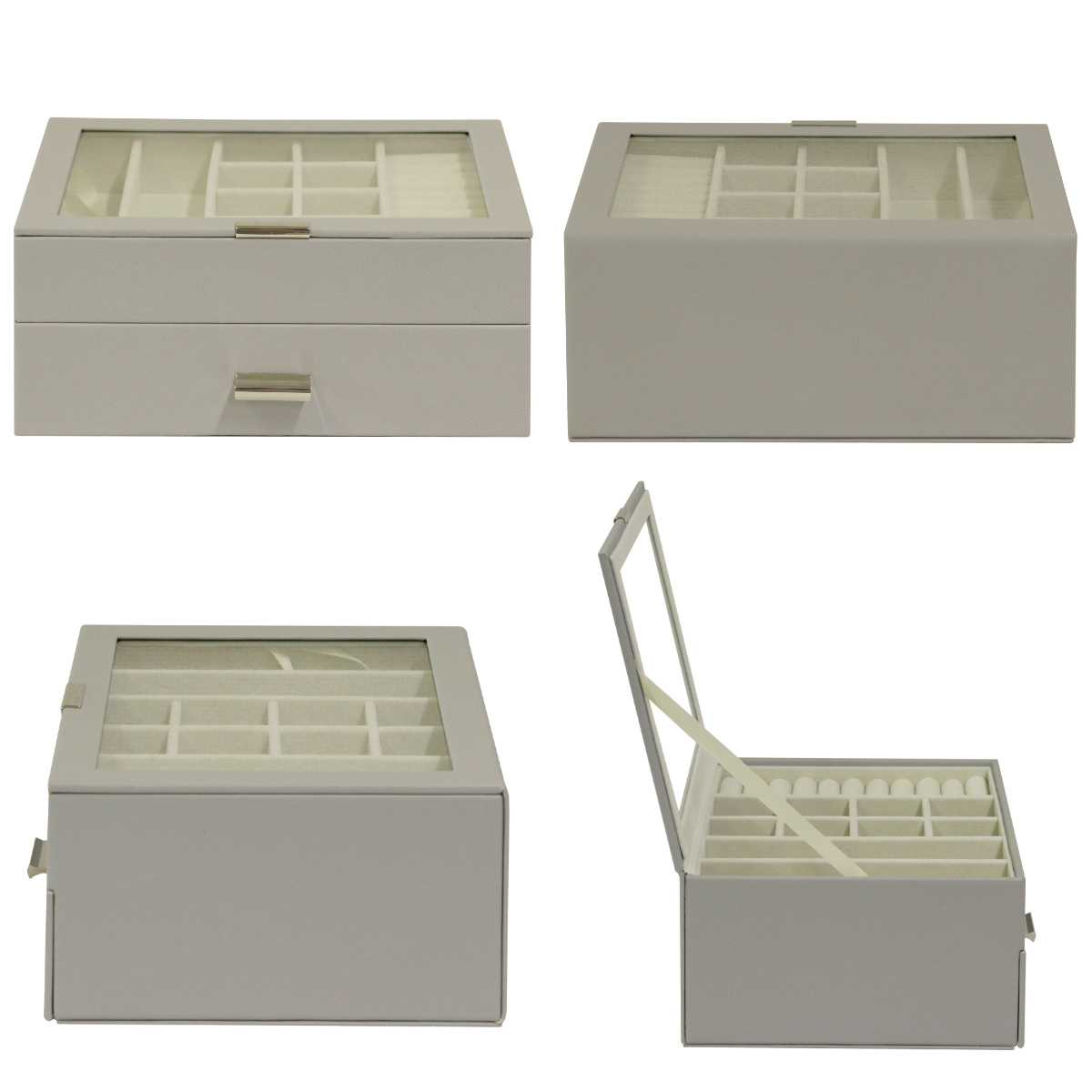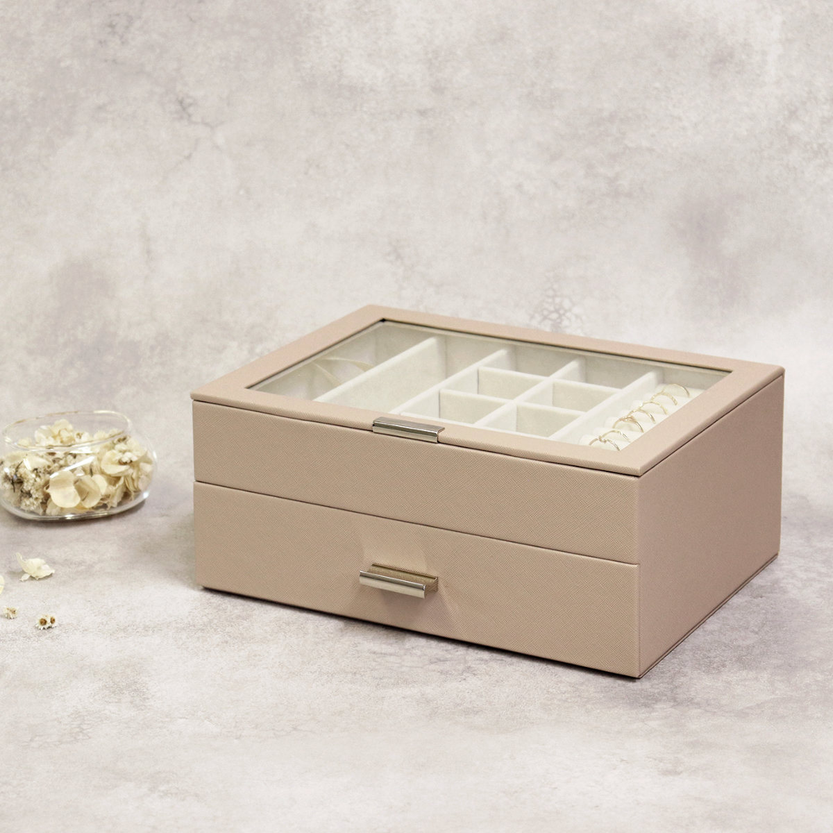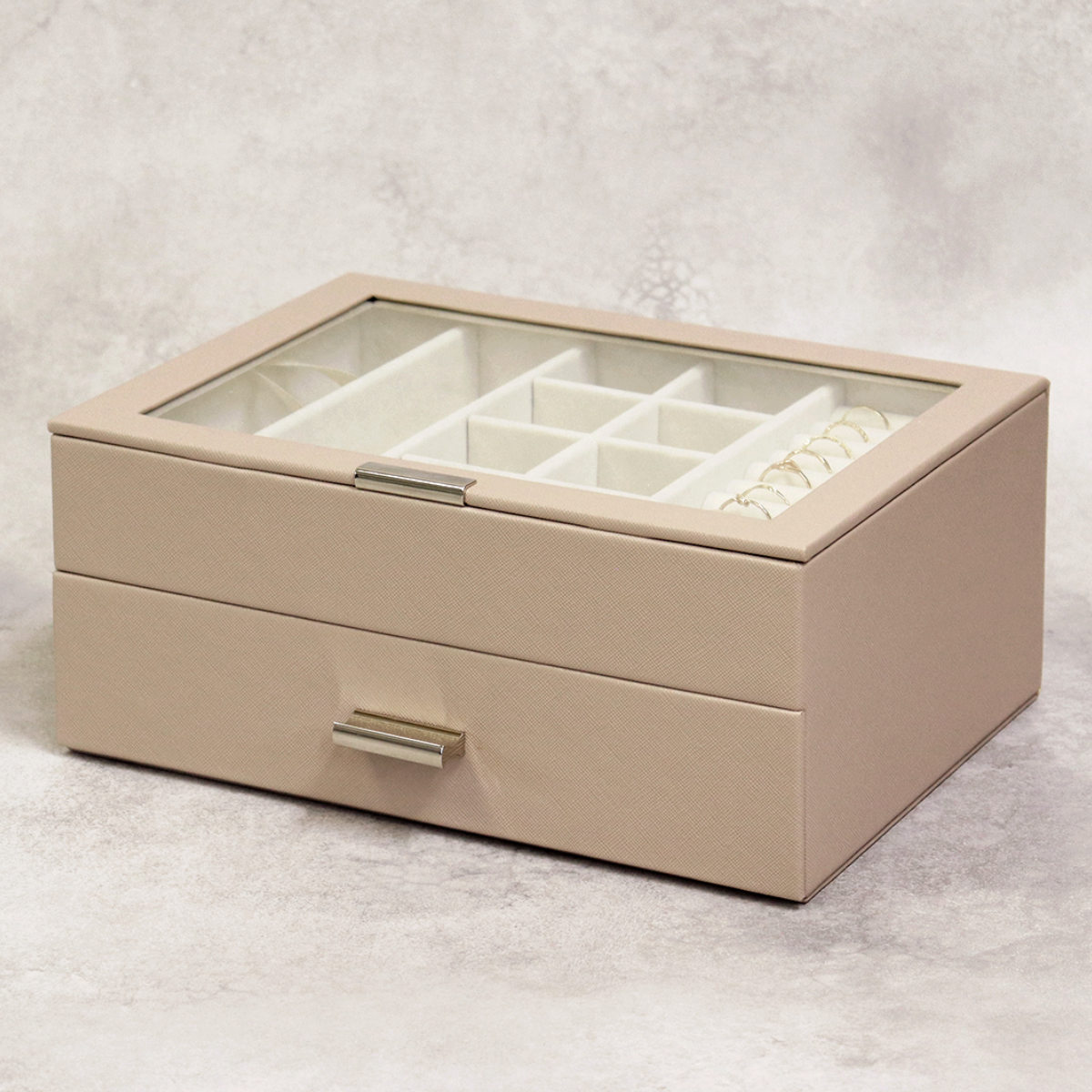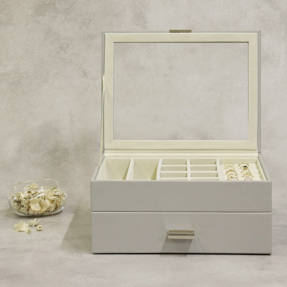 上段は細かく仕切られているので、リングやネックレスなどの収納に最適です。下段はフリースペースで、ブレスレット、サングラスなどの大きなアイテムを収納できます。