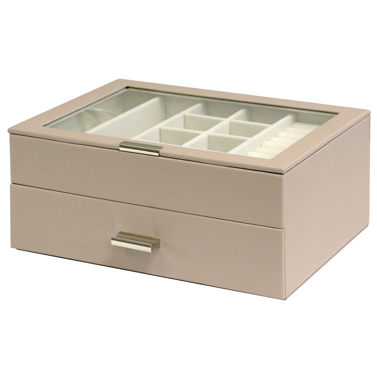 上段は細かく仕切られているので、リングやネックレスなどの収納に最適です。下段はフリースペースで、ブレスレット、サングラスなどの大きなアイテムを収納できます。