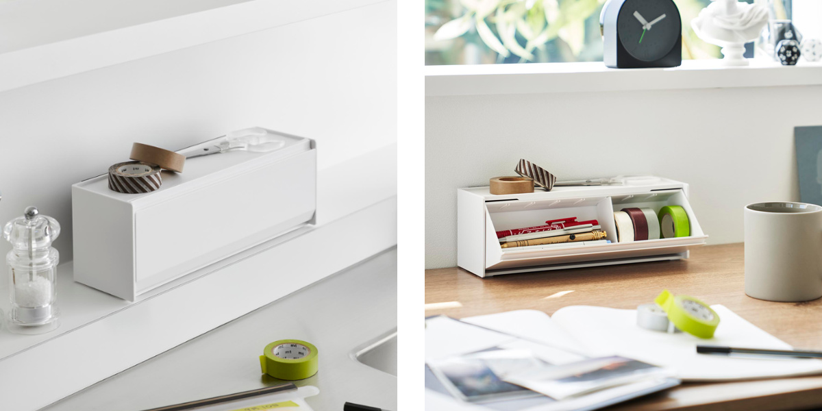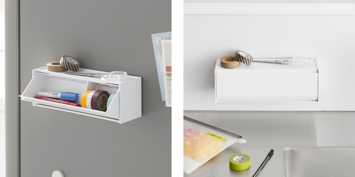 マグネットで壁に取り付けても置いても使えるラベリングに必要なマスキングテープやペンとサッと取り出しやすいケースです。シンプルでスタイリッシュなデザインなので、場所を選ばずスマートに設置できます。