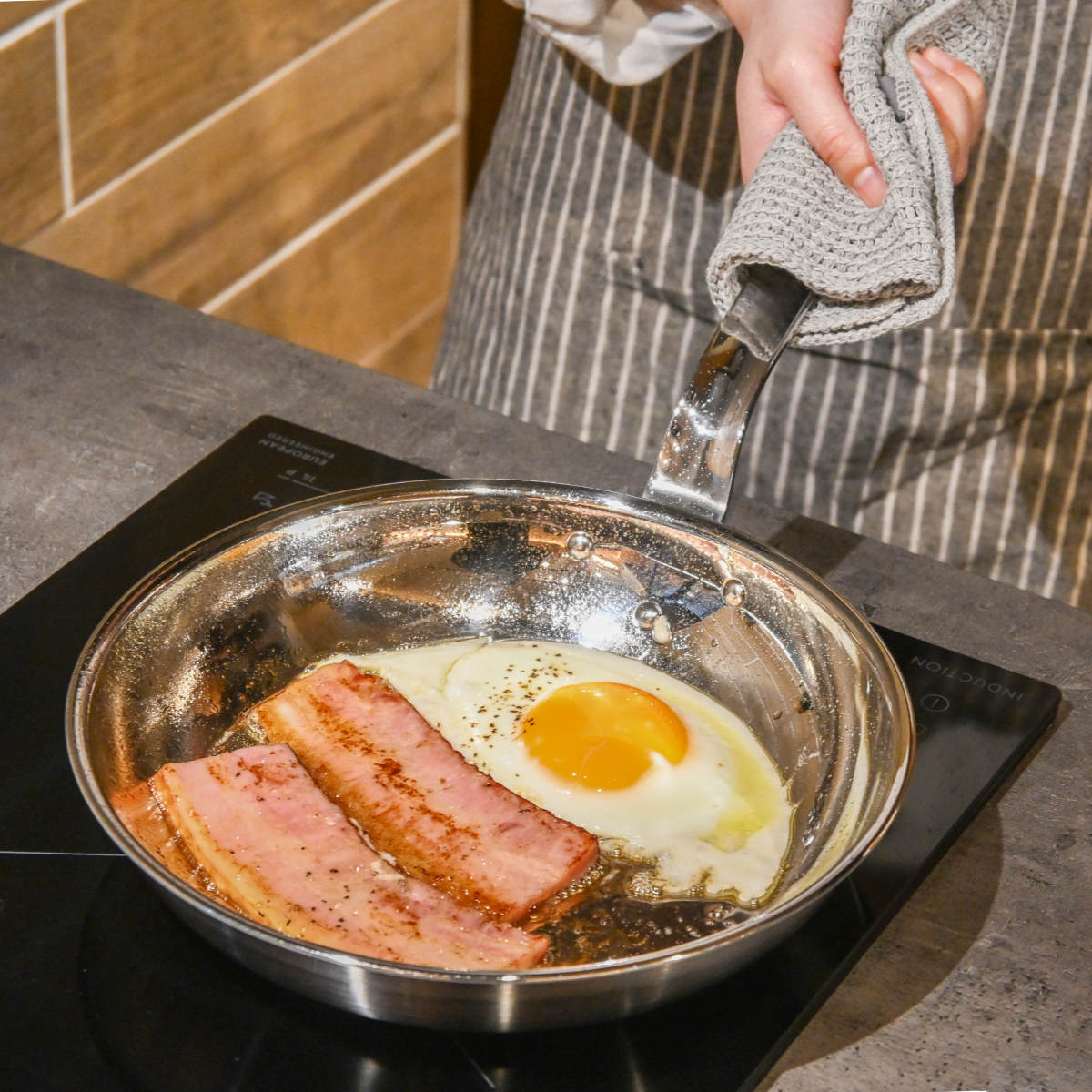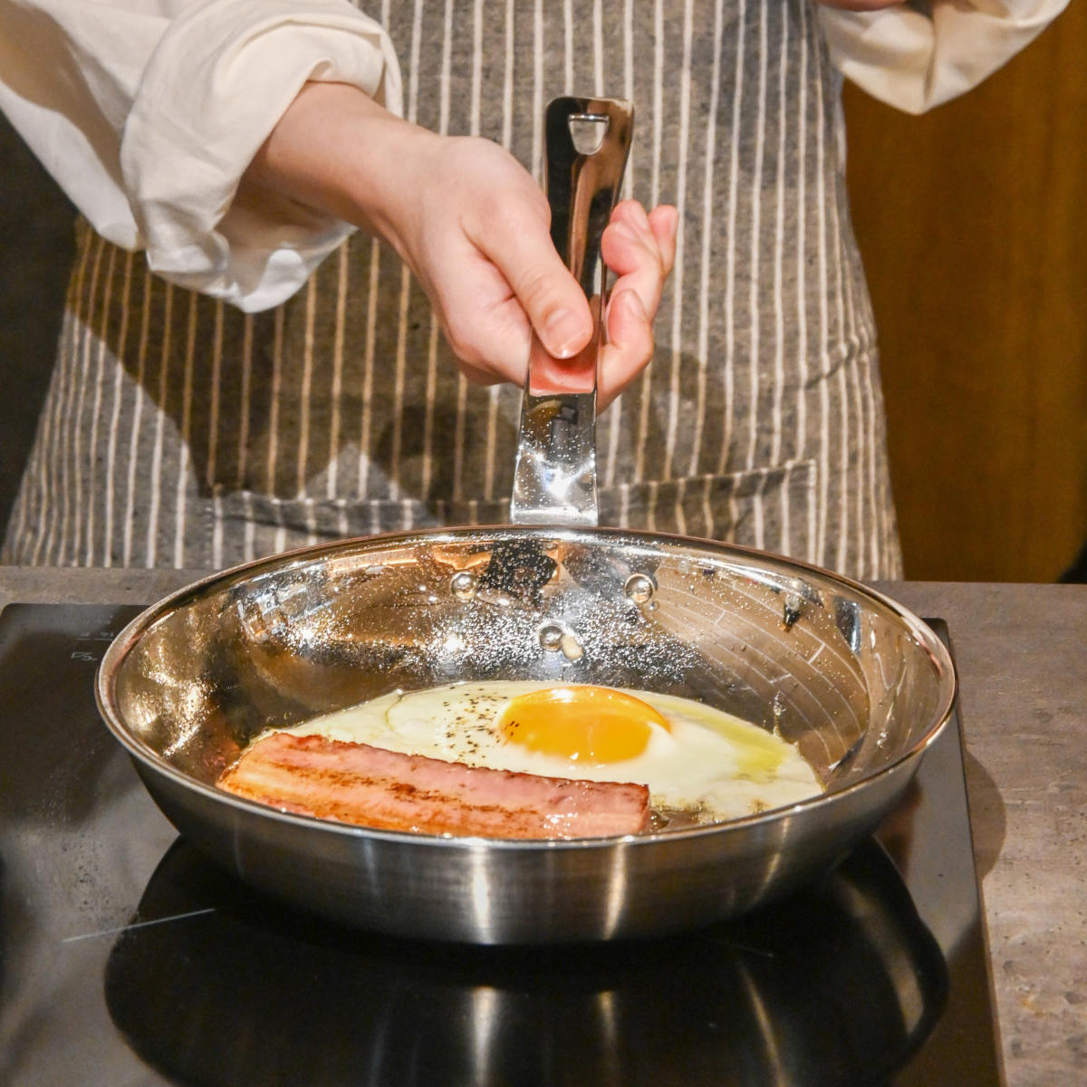 アルミとステンレスを融合させることで「軽量」「IH対応」「素早い加熱」を実現し、ご家庭での使いやすさを叶えました。鉄フライパンさながらの本格仕様でありながら、軽さやお手入れのしやすさなど、毎日使う道具として欠かせない「扱いやすさ」も持ち合わせています。