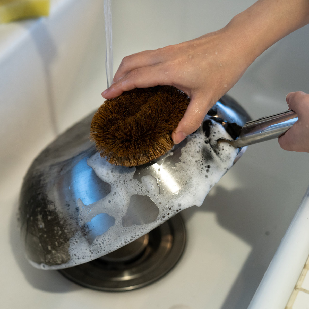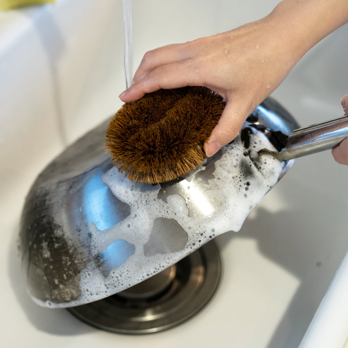 鉄フライパンのような特別なお手入れは不要で、他の洗い物と一緒に食器洗い洗剤で洗えます。また万一焦げ付いた時は、たわしでこすって落とすことができます。