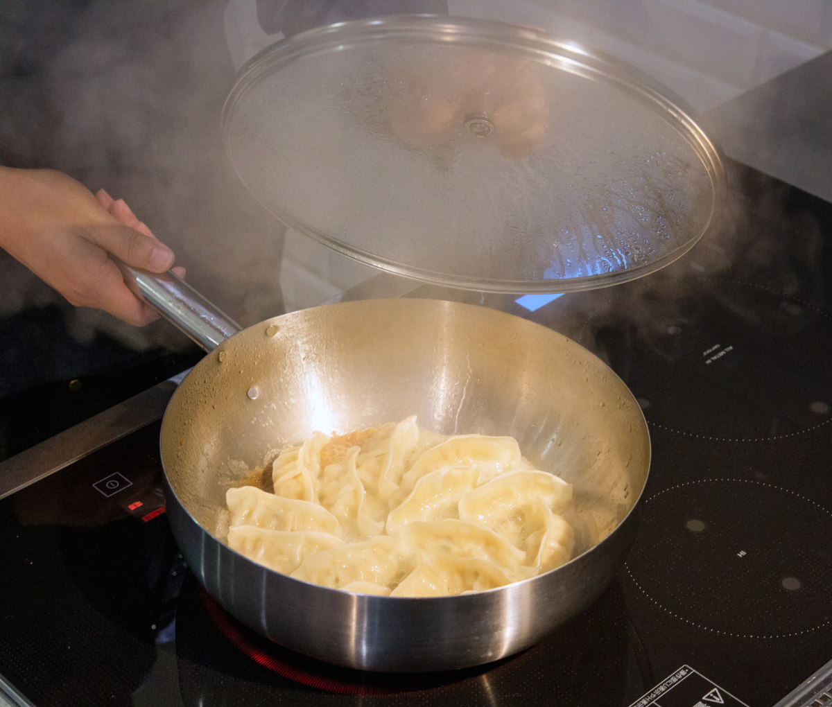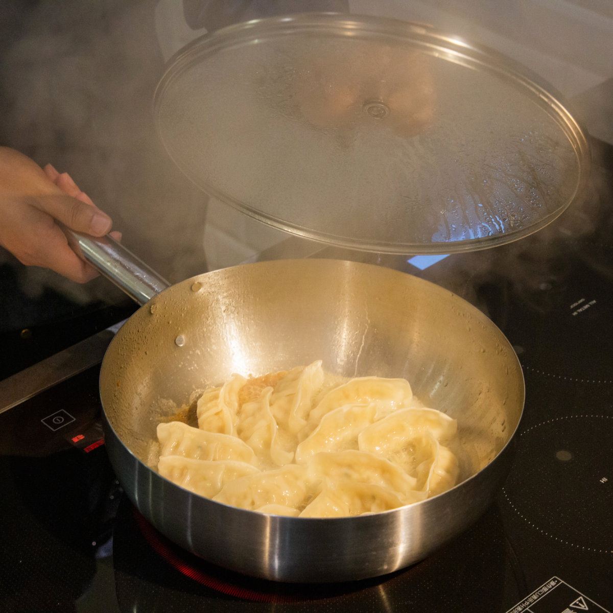 ぴったりフィットする透明のガラス蓋付きなので、蒸し料理も上手に作れます。透明なので蓋を開けずに中の様子が確認でき、美味しい食べ頃を逃しません。