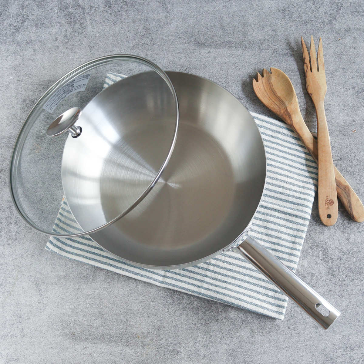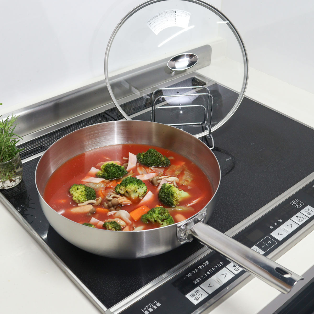 | 材質 | 【フライパン】本体:アルミクラッド三層鋼(ステンレス18-0、アルミ、ステンレス18-8) 持ち手:ステンレス18-8 【蓋】全面強化ガラス、ステンレス18-8 |