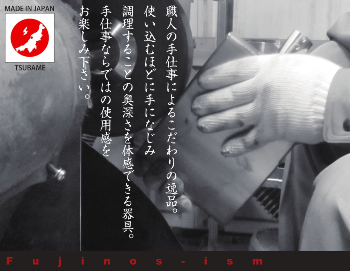 1983年、国産初となる金属が何枚も重なった多重層鋼鍋を開発。1985年には世界で初めてIHクッキングヒーター対応の業務用鍋を世に送り出した実績を持ちます。その後、培った技術を活かし、家庭用IIH対応鍋を開発・製造。「高度な技術の裏側には完成との調和がある」という創業当時からのフジノスイズムは今日まで引き継がれ、現在では国内IHクッキングヒーターのメーカー(パナソニック、日立、三菱)から斡旋、推奨を受ける唯一の鍋メーカーとなりました。