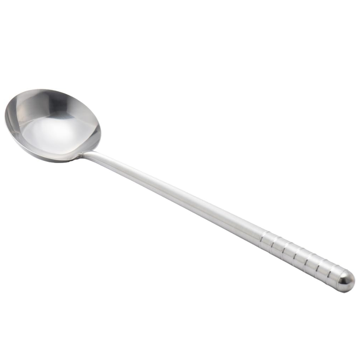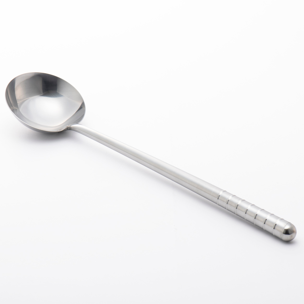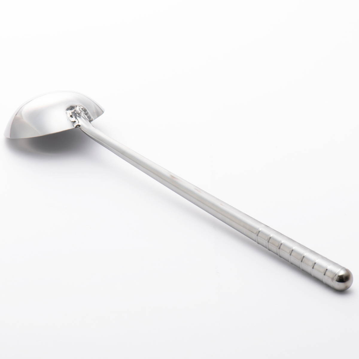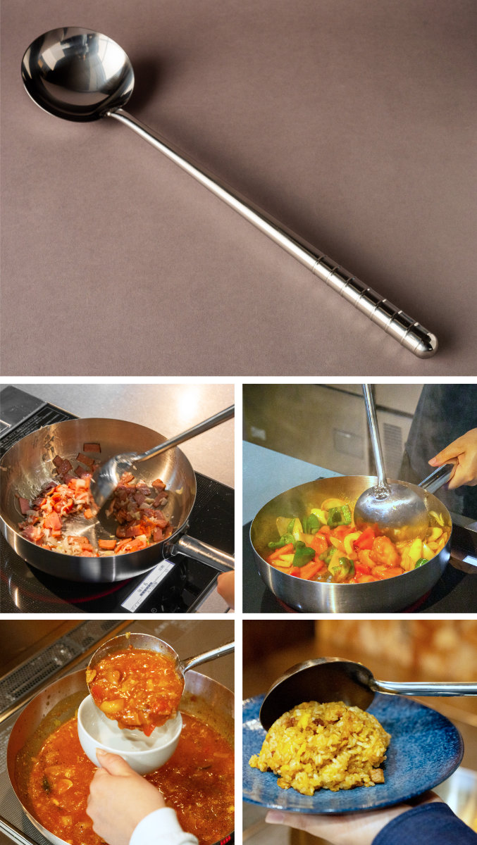 丈夫な18-0ステンレス製の中華お玉です。柄が長く火との距離があるため、高温調理も安心して快適にこなせます。またお玉と柄の角度が浅くターナーに近い形をしているため、「炒める」「混ぜる」「つぶす」「すくう」「盛る」と、さまざまな使い方ができます。