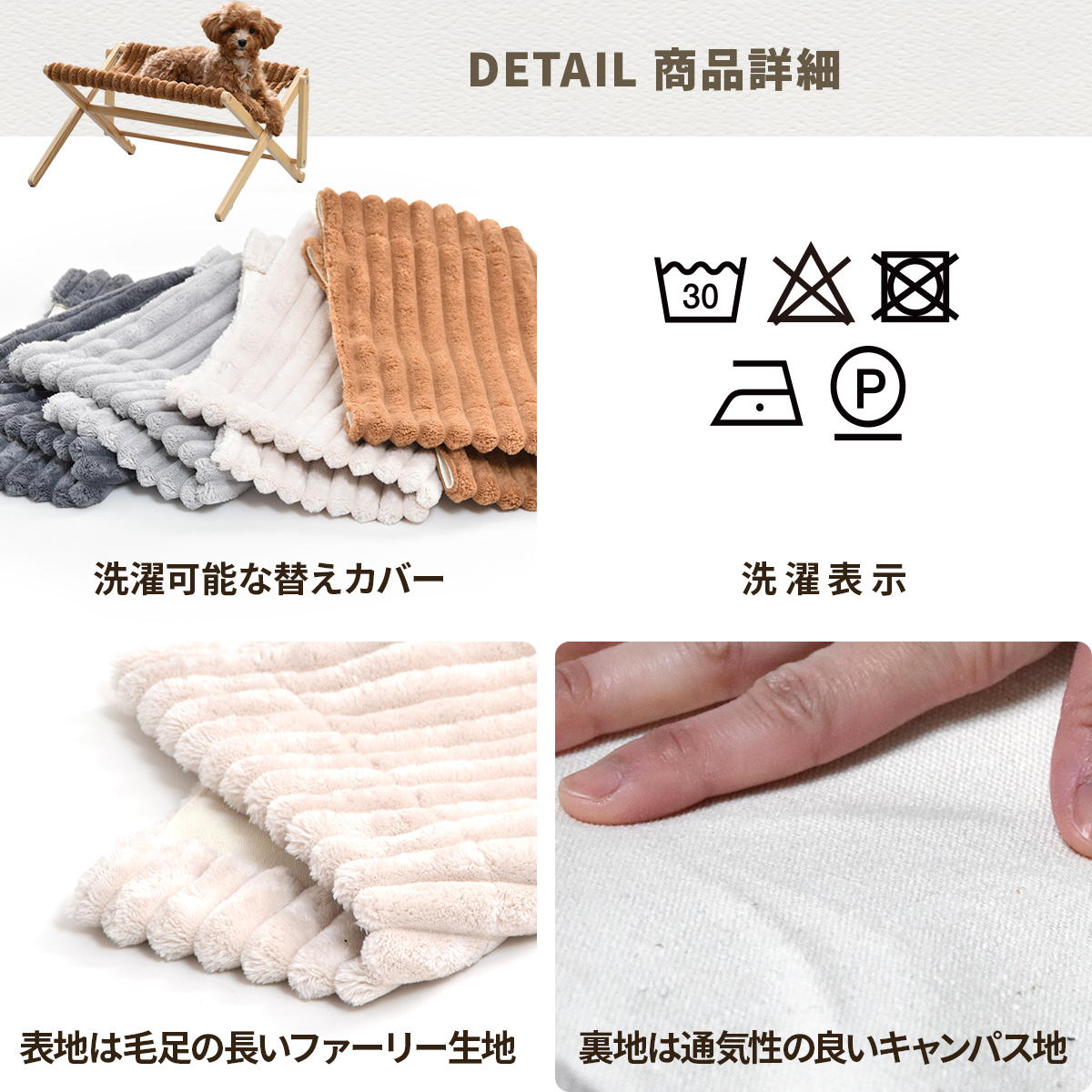 カバーの表面は毛足が長くふんわり柔らかいファーリー生地、裏面はさらりとした肌触りの暑い季節にぴったりなキャンバス生地を使用しています。耐久性と撥水性が高く、汚れが付きにくい綿混素材です。