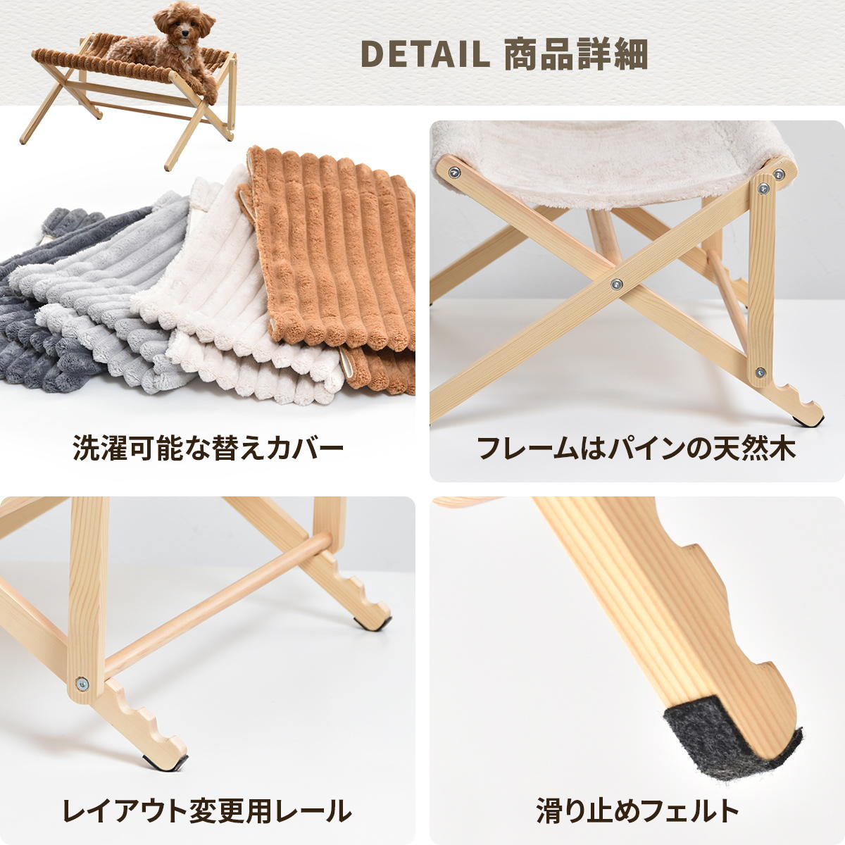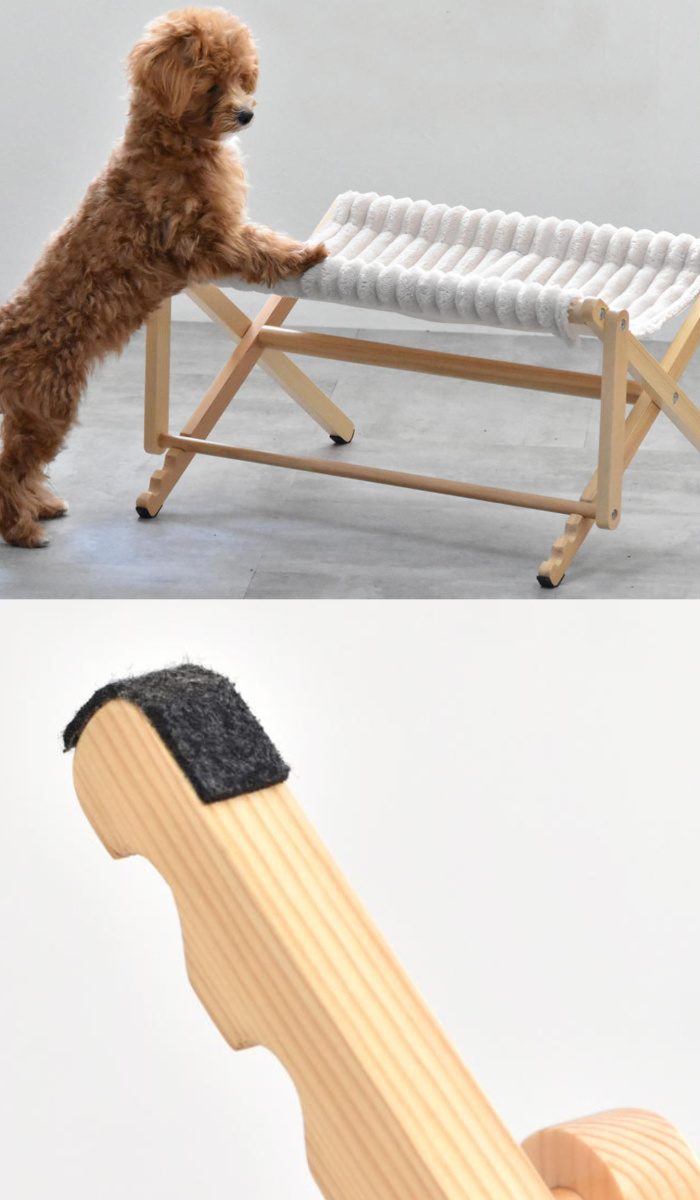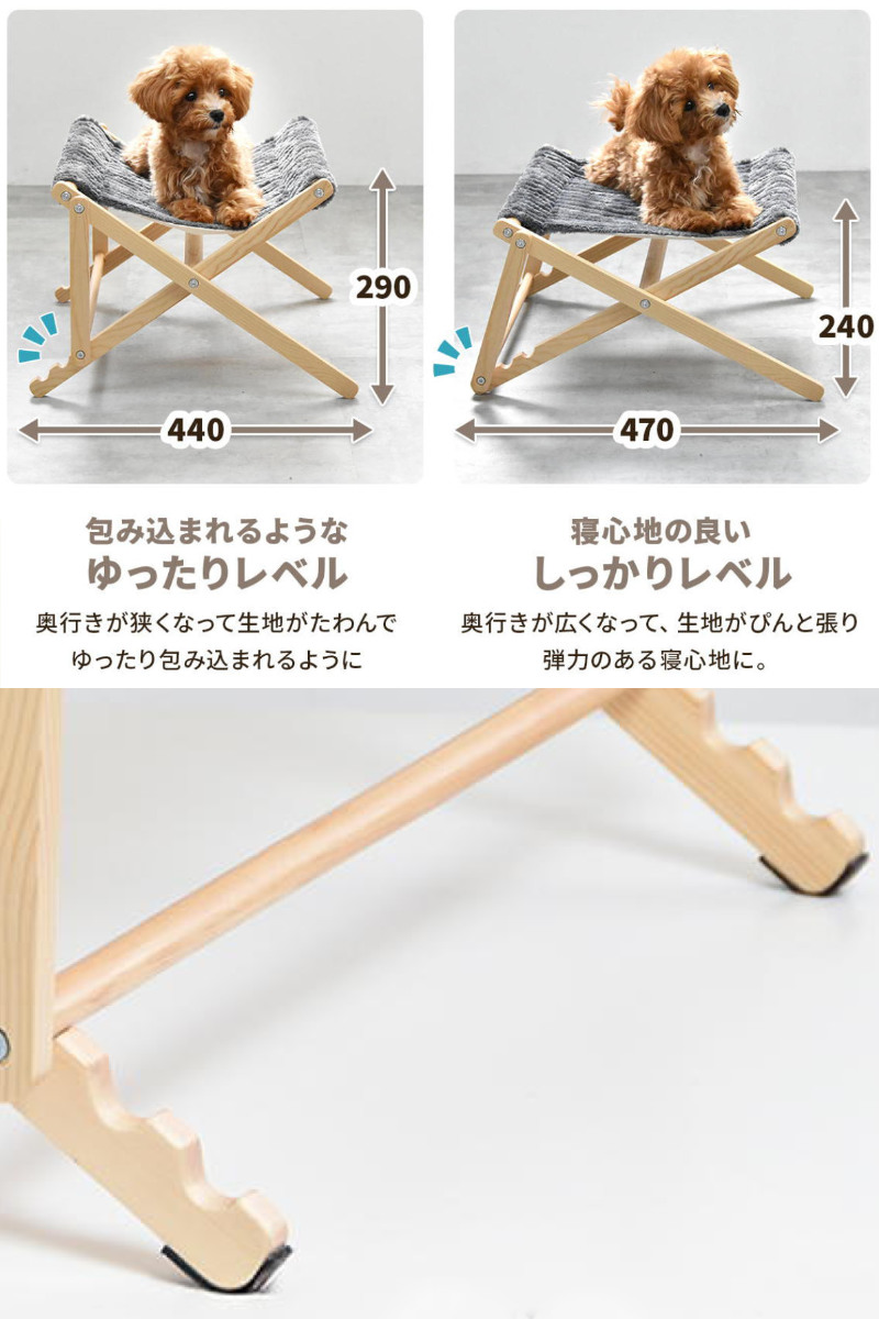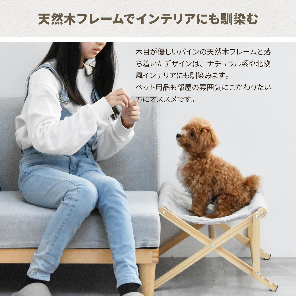 木目が優しいパインの天然木フレームです。小型犬が飛び乗っても揺れすぎず、転倒しにくい設計なので安心して使用できます。滑り止め付きで床を傷つけにくいです。