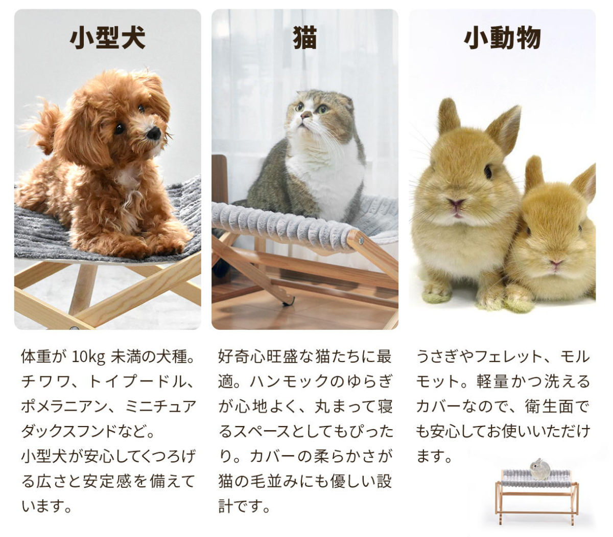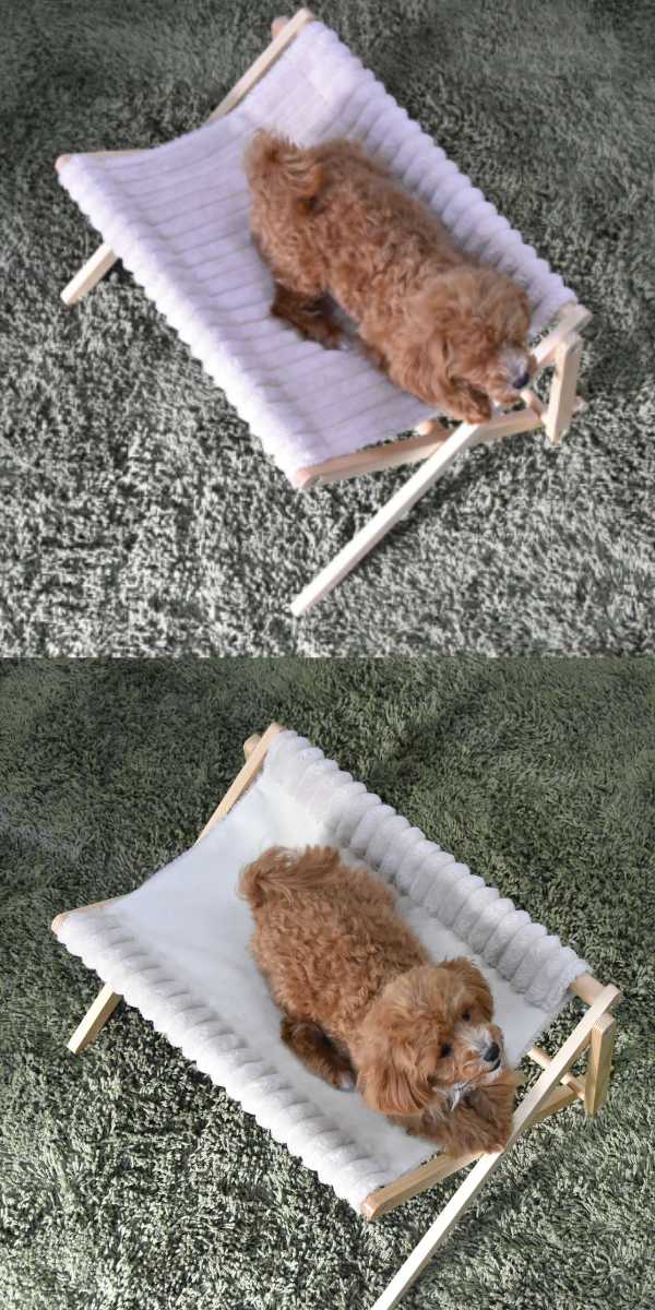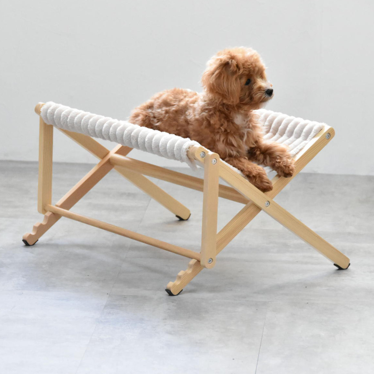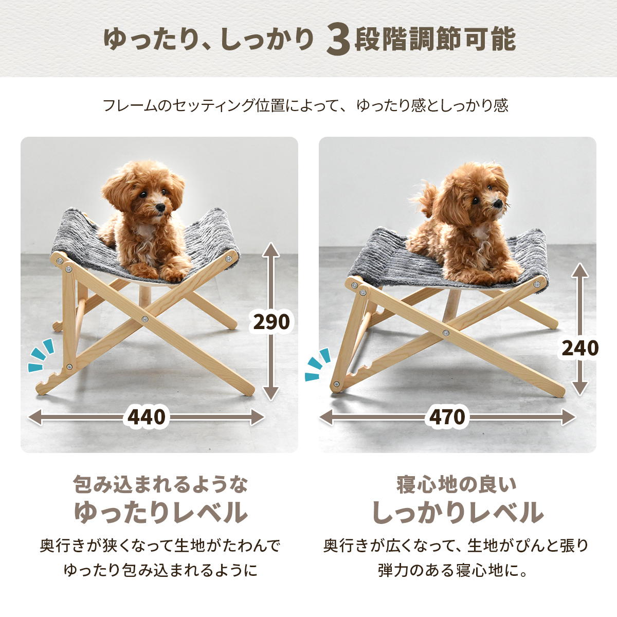 木目が優しいパインの天然木フレームです。小型犬が飛び乗っても揺れすぎず、転倒しにくい設計なので安心して使用できます。滑り止め付きで床を傷つけにくいです。