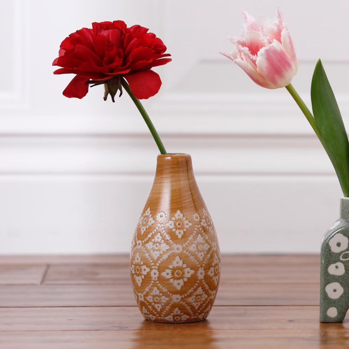 東欧風の絵柄がかわいい小さなセラミックベースです。オブジェとしてお部屋にさりげなく飾っておくだけでも雰囲気のある空間を演出してくれます。