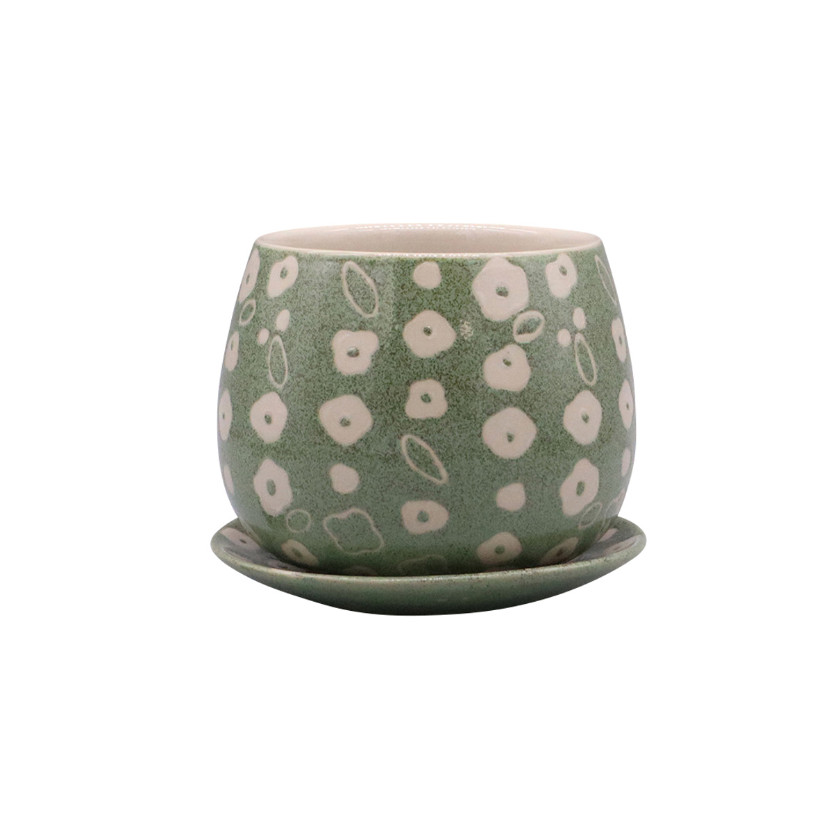 東欧風の絵柄がかわいいセラミックポットです。内径約8cmなので、テーブルサイズの観葉植物などを植えるのにぴったりなサイズ感です。ソーサー付きなので、水がこぼれる心配もなくそのまま置くことができます。