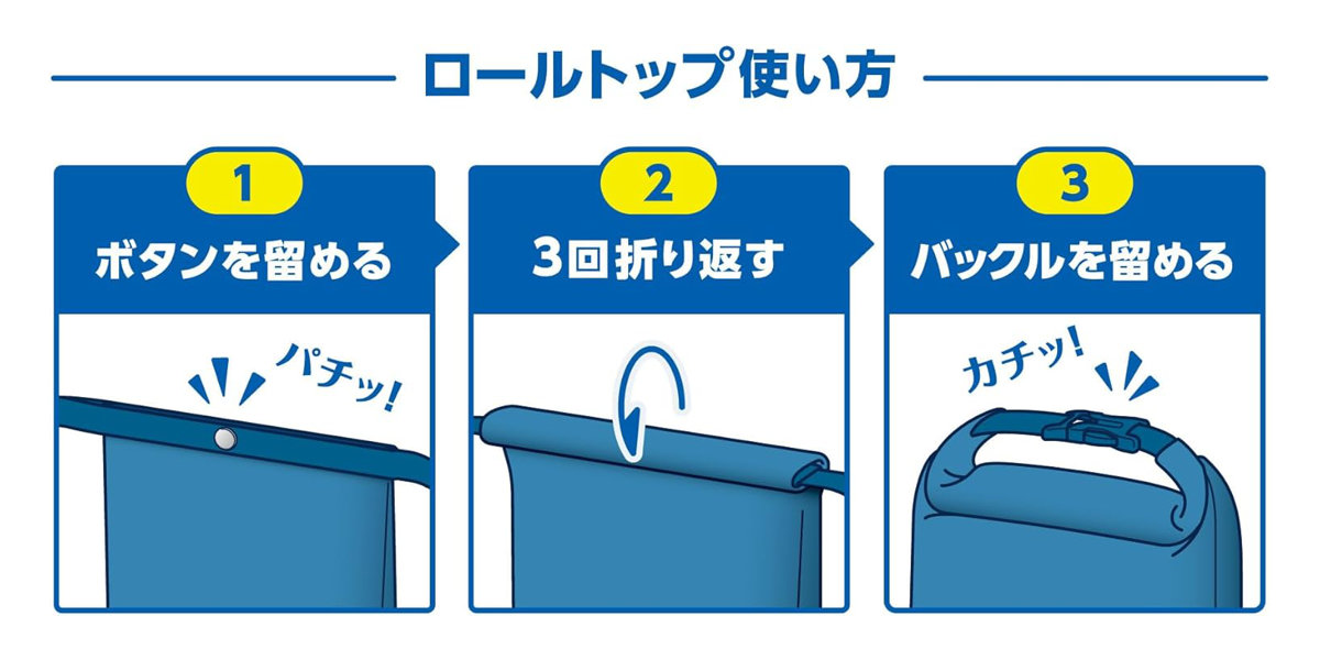 バッグの口元部分を折り返してバックルを留める「ロールトップ型」のデザインです。口が大きく開くので、モノの出し入れがしやすいのもうれしいポイントです。