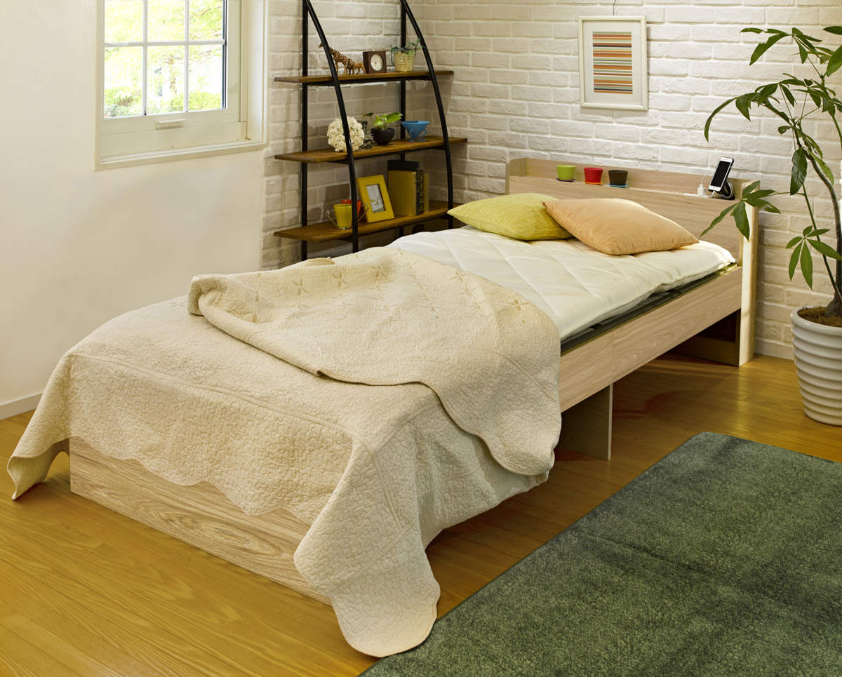 枕元にメガネなどの小物を置けるヘッドボード付きです。2口コンセント付きなので、寝ている間にスマートフォンやタブレットの充電が可能です。コンセントは、組み立ての際に左右どちらに取り付けるかを選んでいただけます。