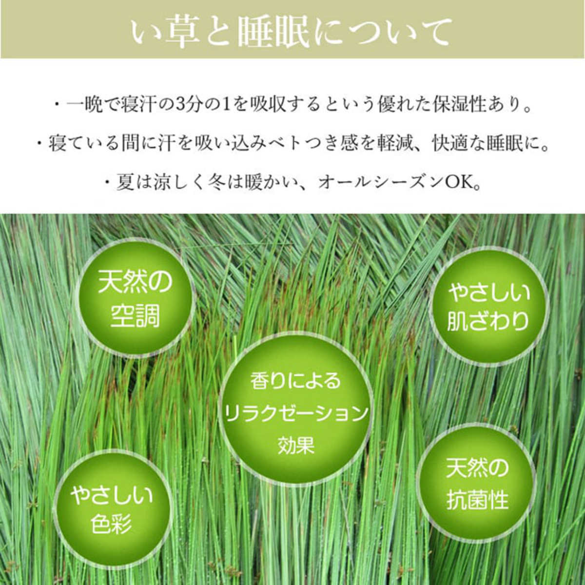 い草は、寝汗の3分の1を吸収するという優れた吸湿性があります。寝ている間に汗を吸い込み、ベトつき感を軽減して快適な睡眠環境へ整えます。夏は涼しく、冬は暖かいのでオールシーズンお使いいただけます。