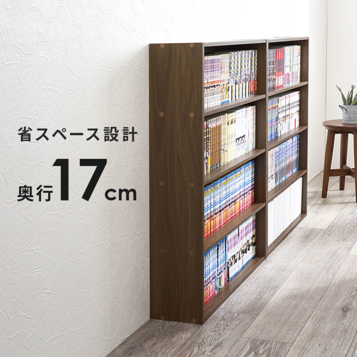 奥行わずか17cmのスリムな設計のコミックラックです。1列収納なので、全ての本の背表紙がよく見えて、読みたい本を簡単に手に取れます。1人暮らしのお部屋にはもちろん、リビング収納や子ども部屋の収納としても活躍します。