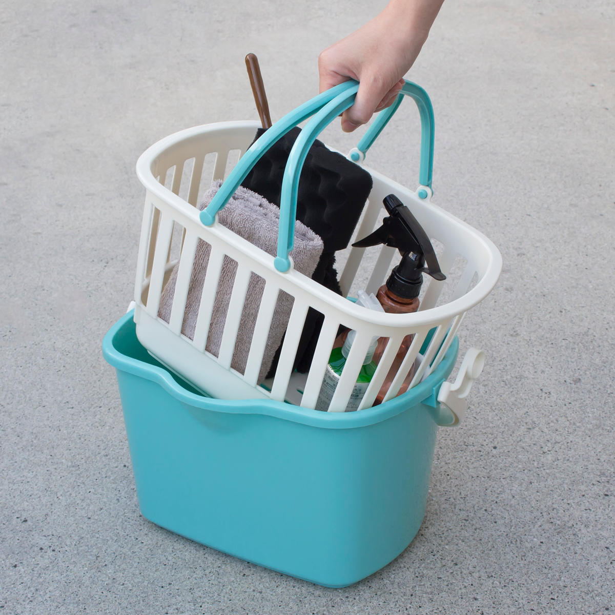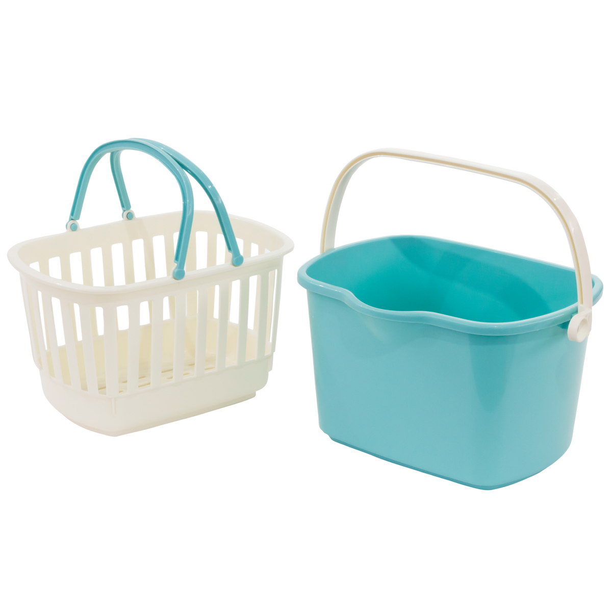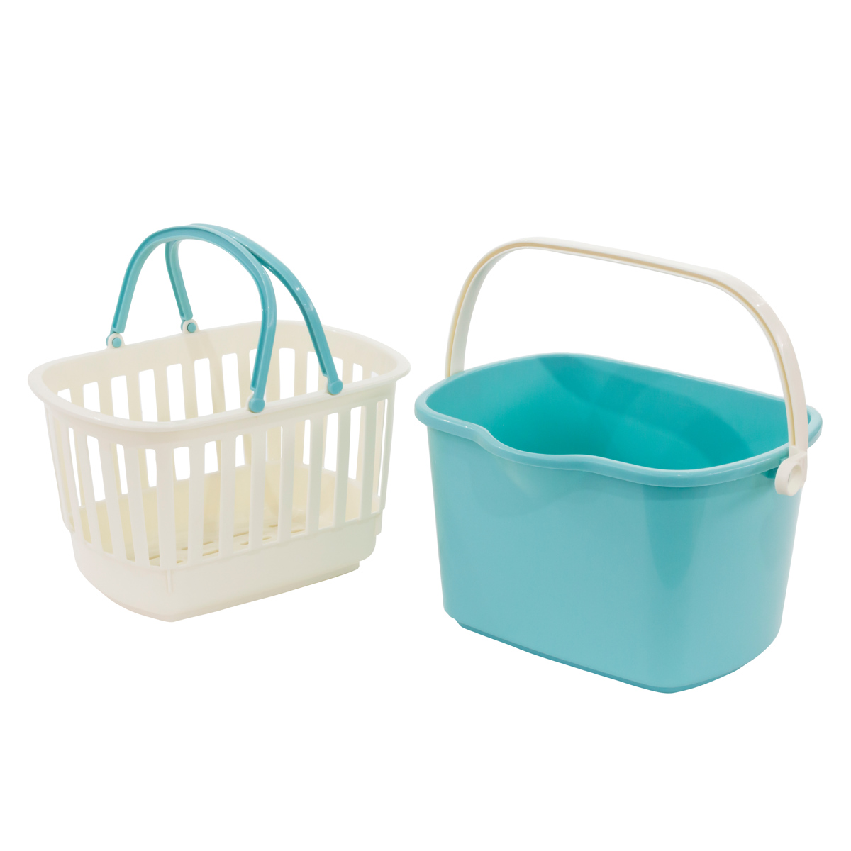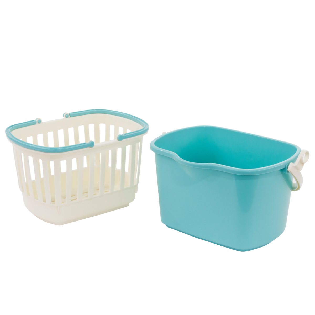 小物を収納できるバスケットと幅広角型バケツのセットです。それぞれにハンドルが付いているので、別々に使用できます。