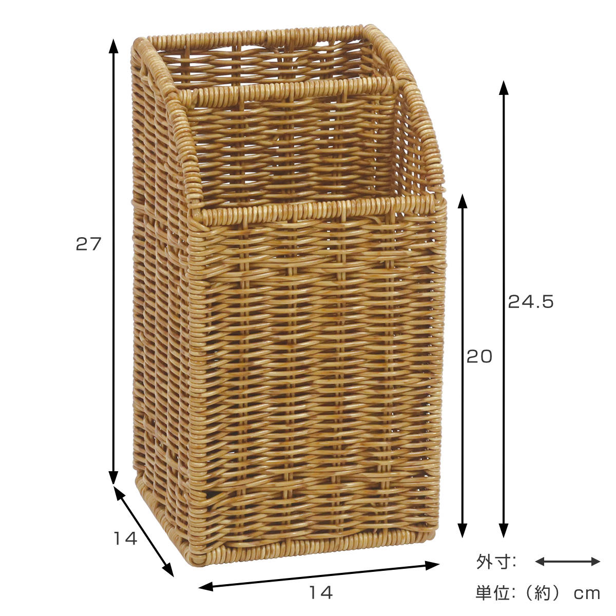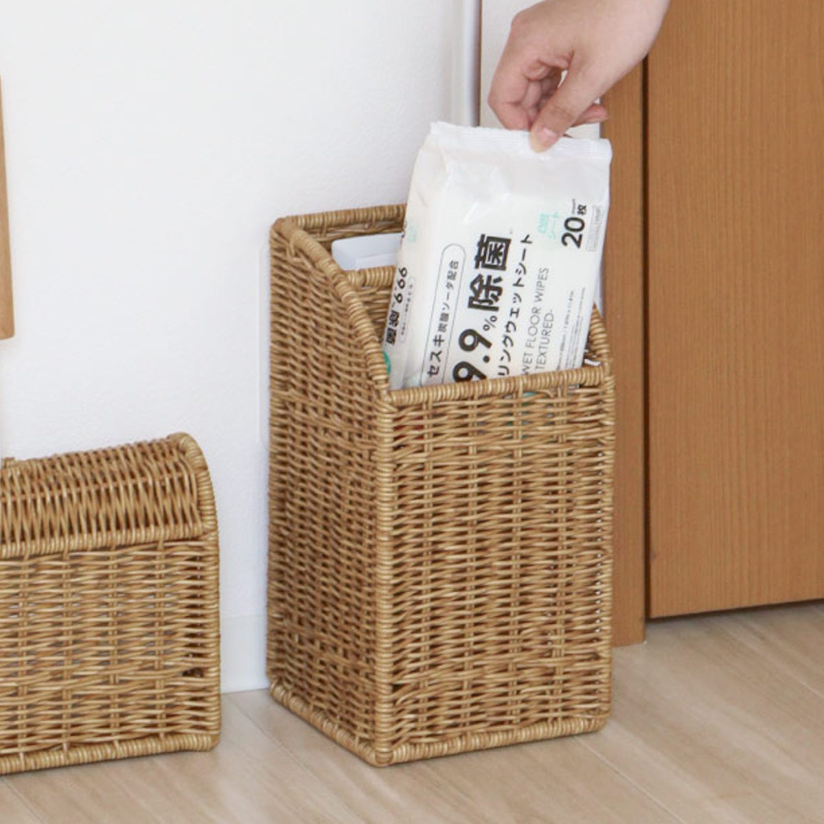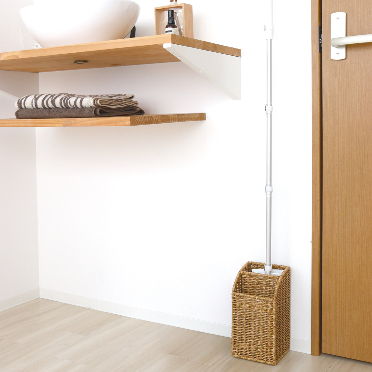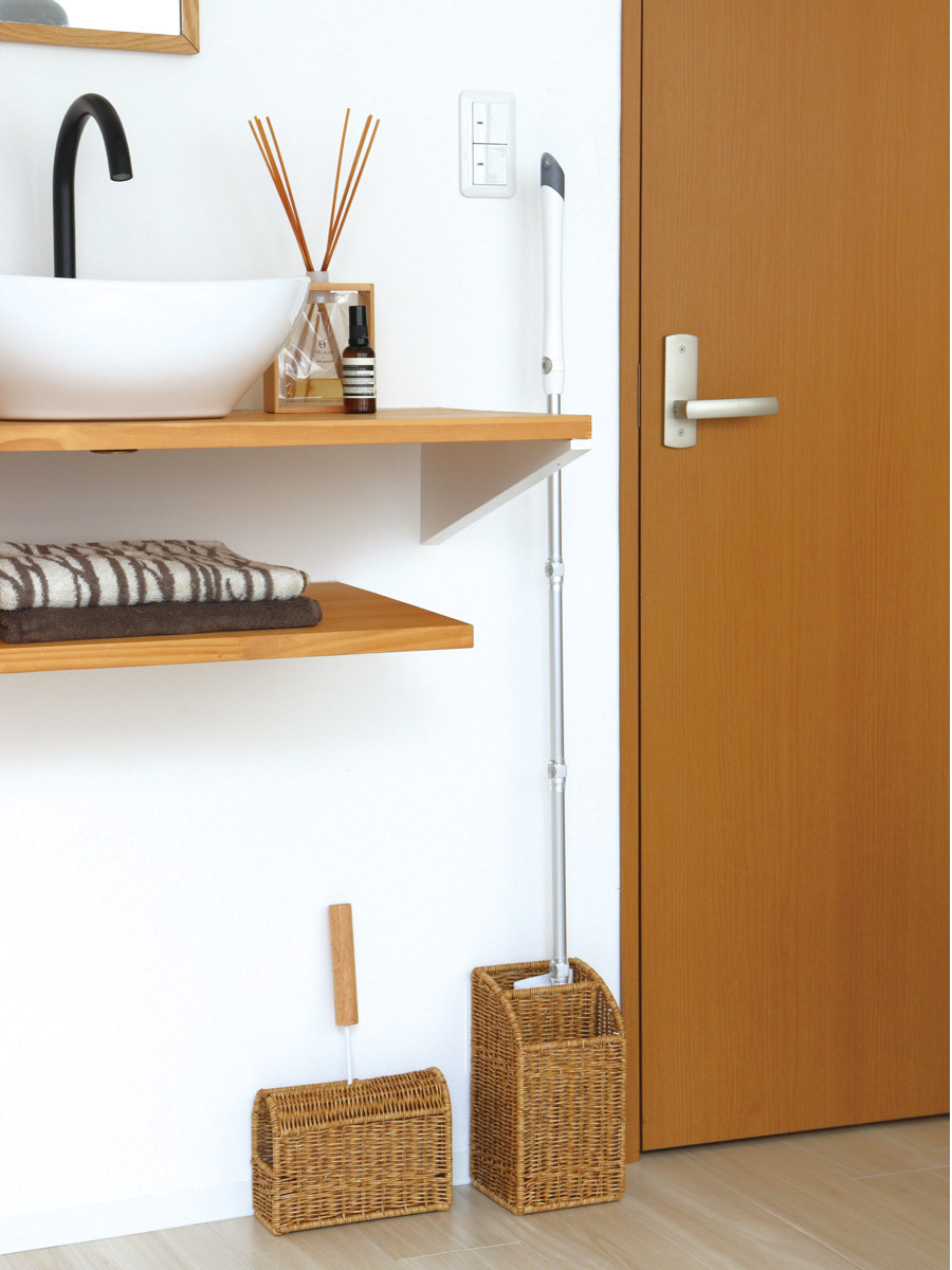 置き場所に困るフローリングワイパーを立てて収納できるスタンドです。長いワイパーもグラつくことなく安定して置くことができます。奥行き約14cmとスリムなサイズ感と、天然素材で編まれたような温かみを感じるかご編みの風合いが、お部屋に違和感なく溶け込んでくれます。