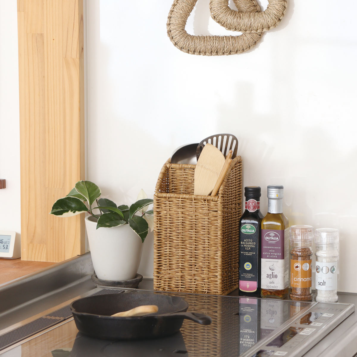まるで天然素材のかごのように見えるポリプロピレンとポリエチレンを使った手編みバスケット、UTILE(ユティル)シリーズです。水洗いができるため、水周りでの使用にも重宝します。実用的な機能を備えたインテリアにもかわいいバスケットです。UTILEシリーズで収納を揃えるのも統一感が出ておすすめです。