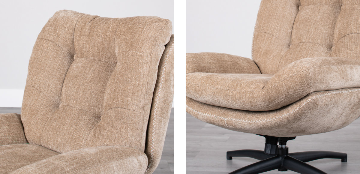 疲れた身体を癒してくれるパーソナルチェアです。ボタン留めデザインとステッチがアクセントになっており、レトロ感のある優しい印象を与えてくれます。読書をしたりちょっと居眠りをしたり、ゆったりした時間をお過ごしいただけます。