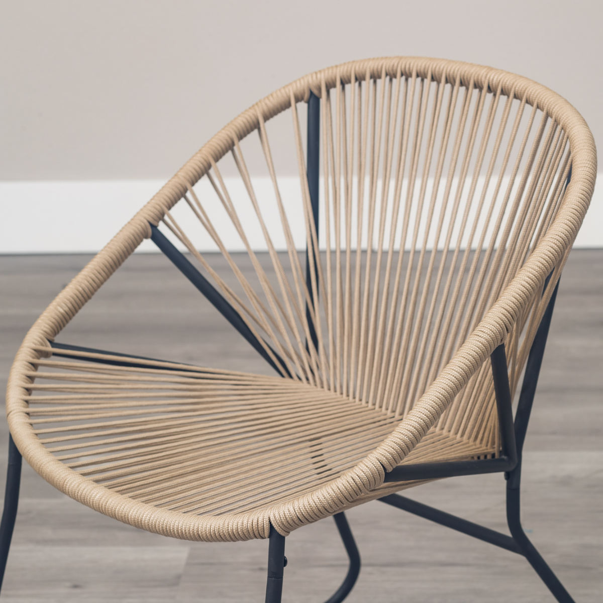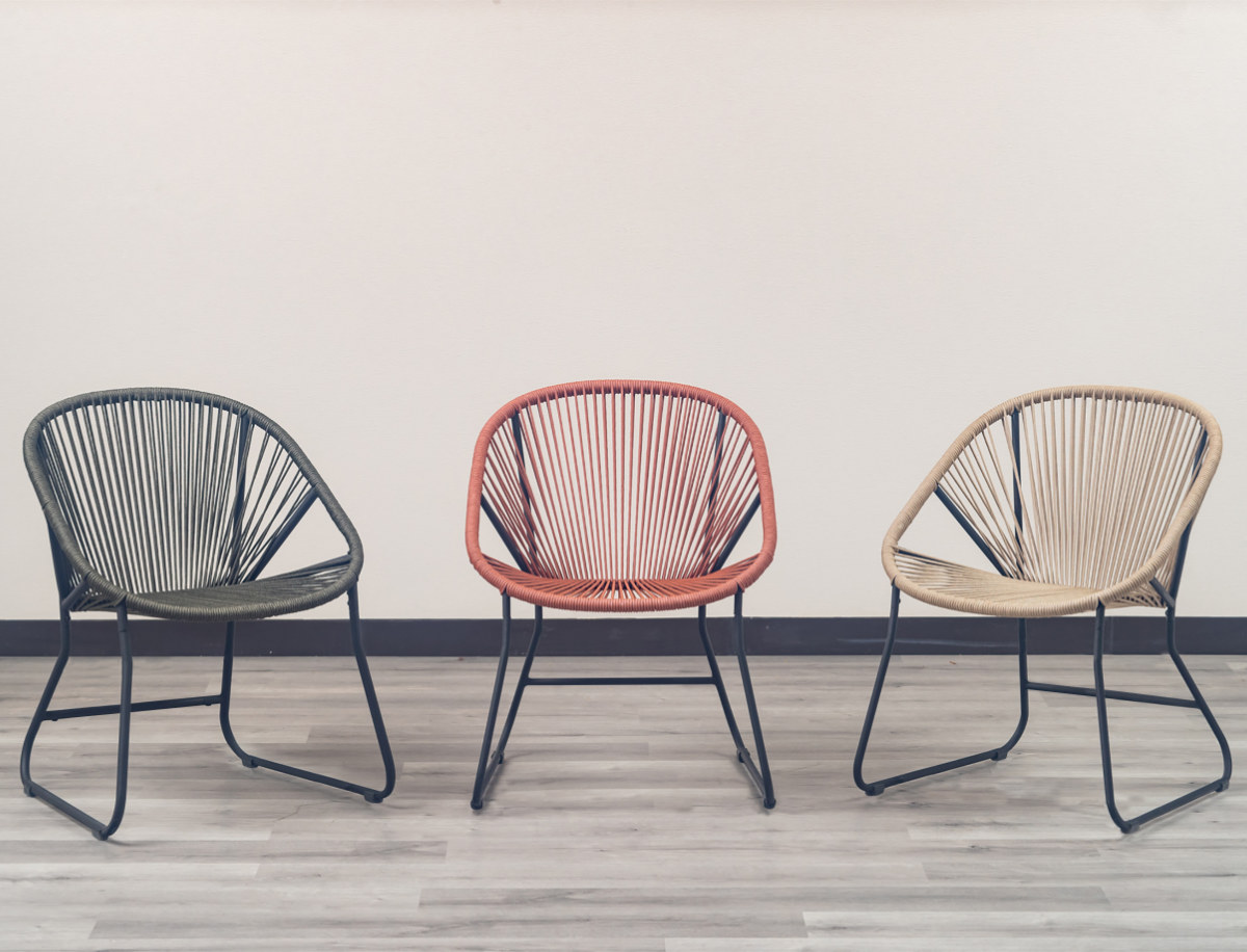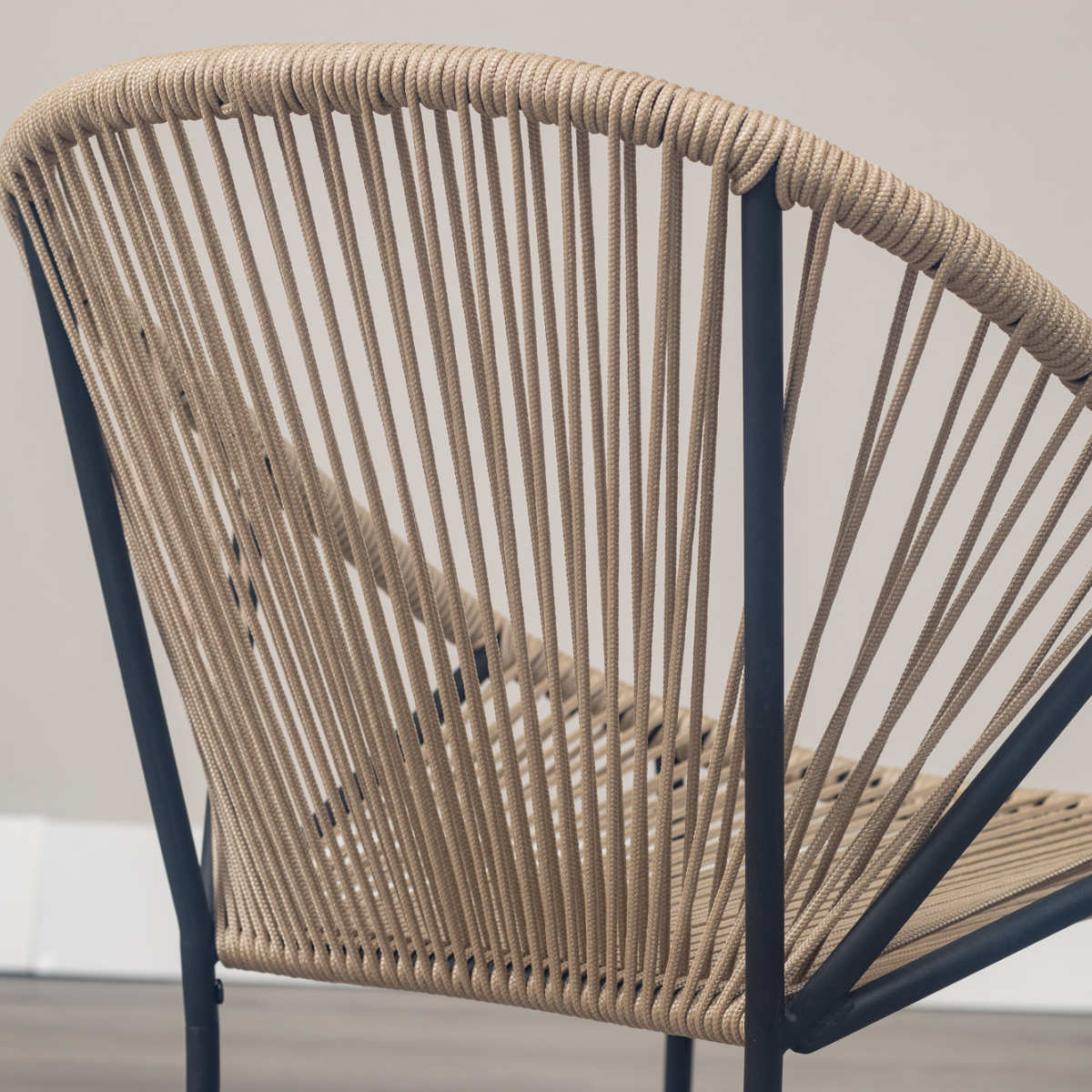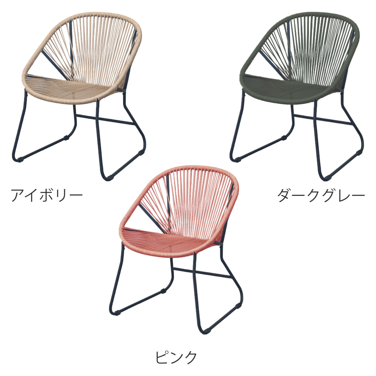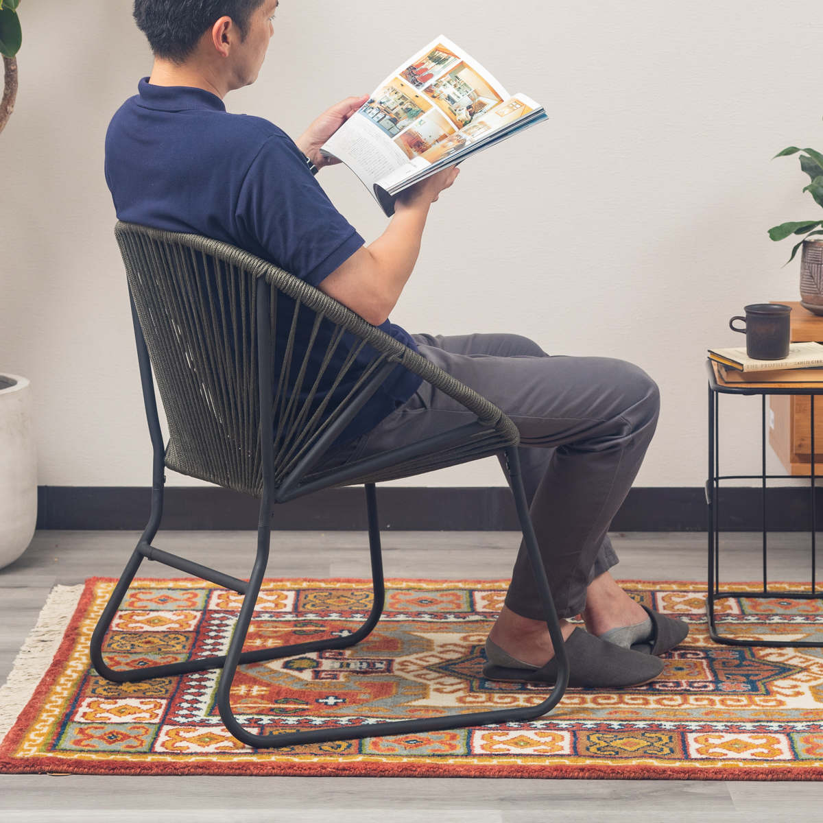 温かみのあるロープとマットなブラックスチールのフレームを組み合わせたチェアです。海外風インテリアのような開放的な雰囲気を持ち合わせています。手作業で編んでいるため、どこか柔らかな印象でインテリアとして愛着が湧いてくるアイテムです。