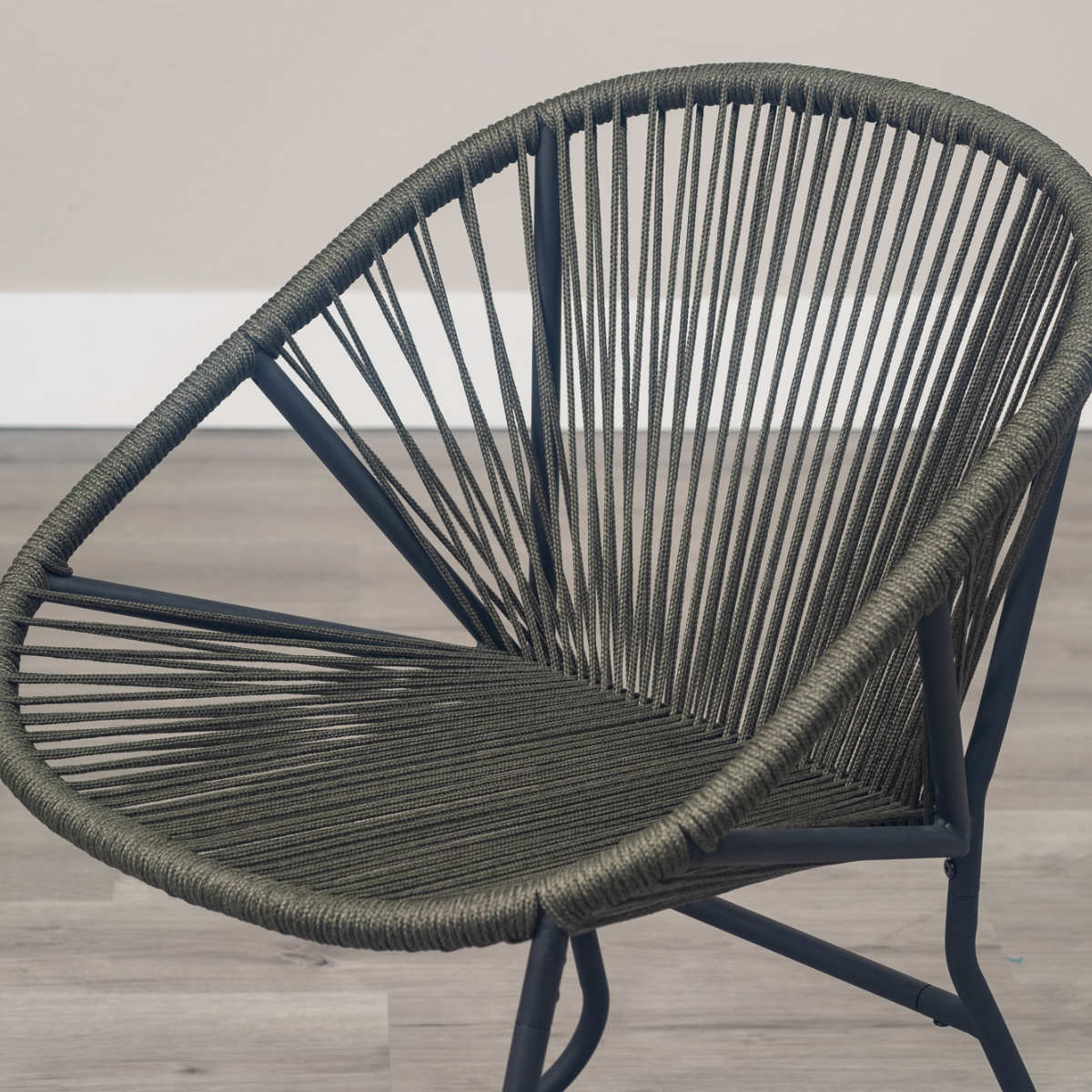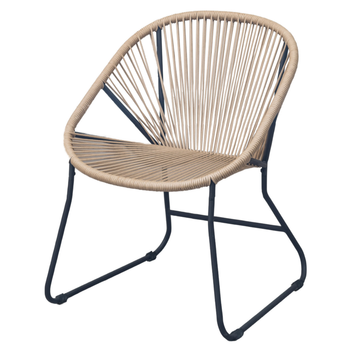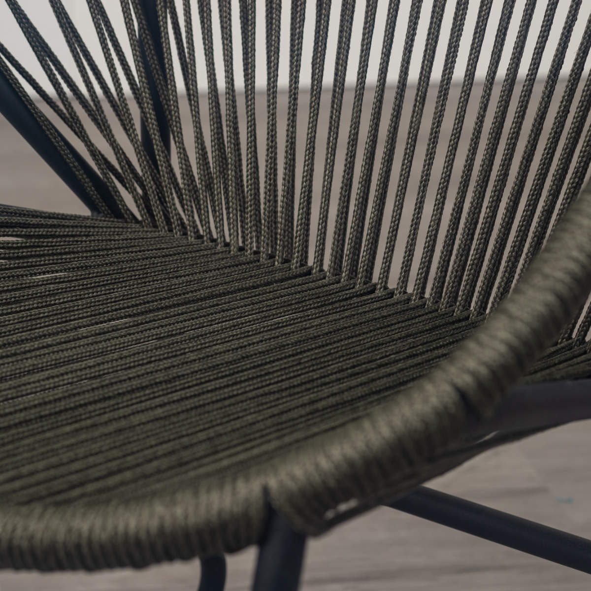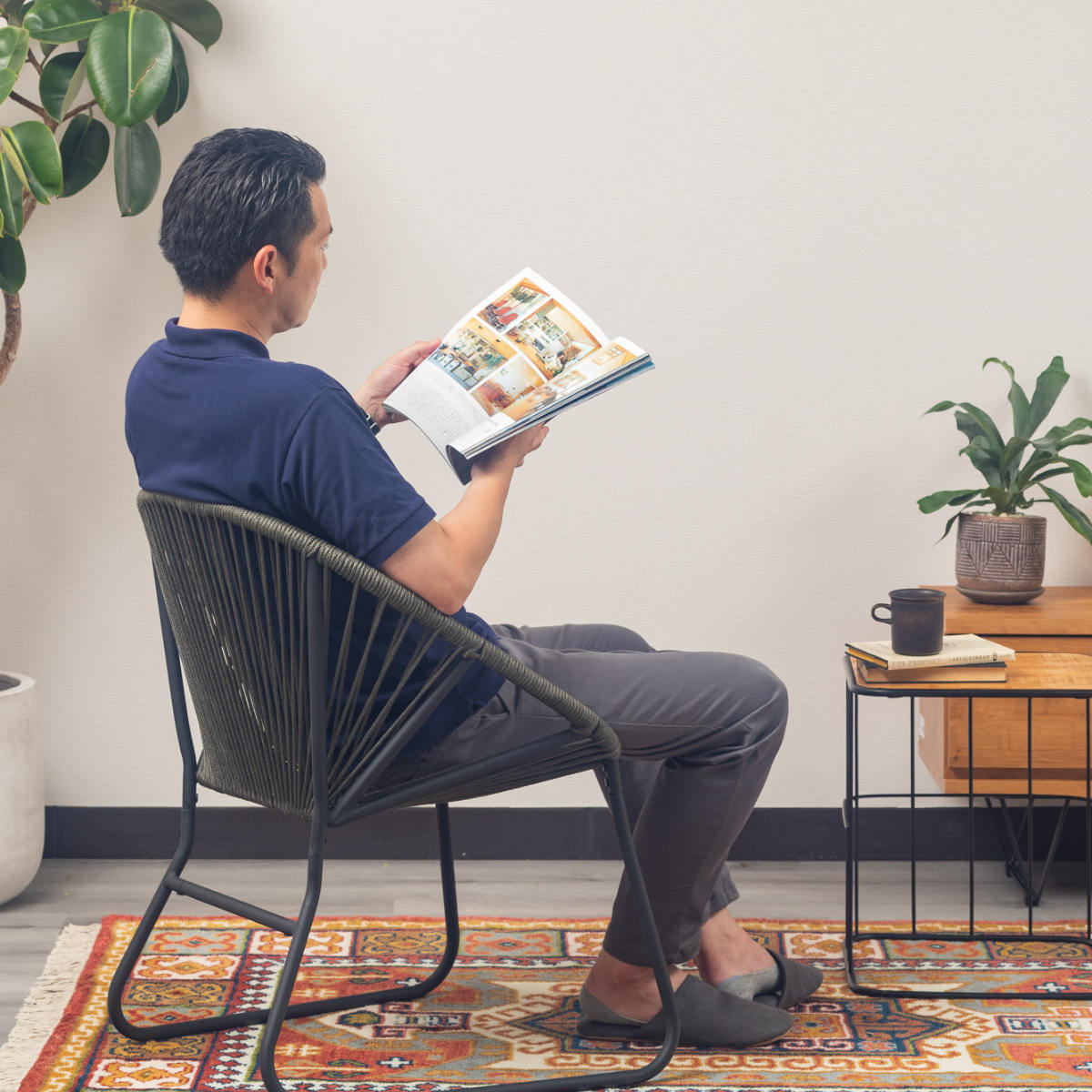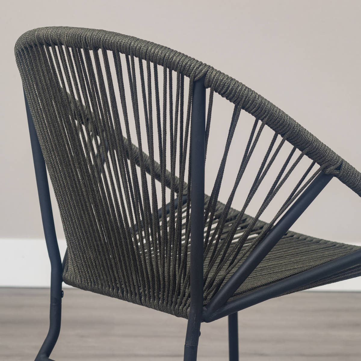 温かみのあるロープとマットなブラックスチールのフレームを組み合わせたチェアです。海外風インテリアのような開放的な雰囲気を持ち合わせています。手作業で編んでいるため、どこか柔らかな印象でインテリアとして愛着が湧いてくるアイテムです。